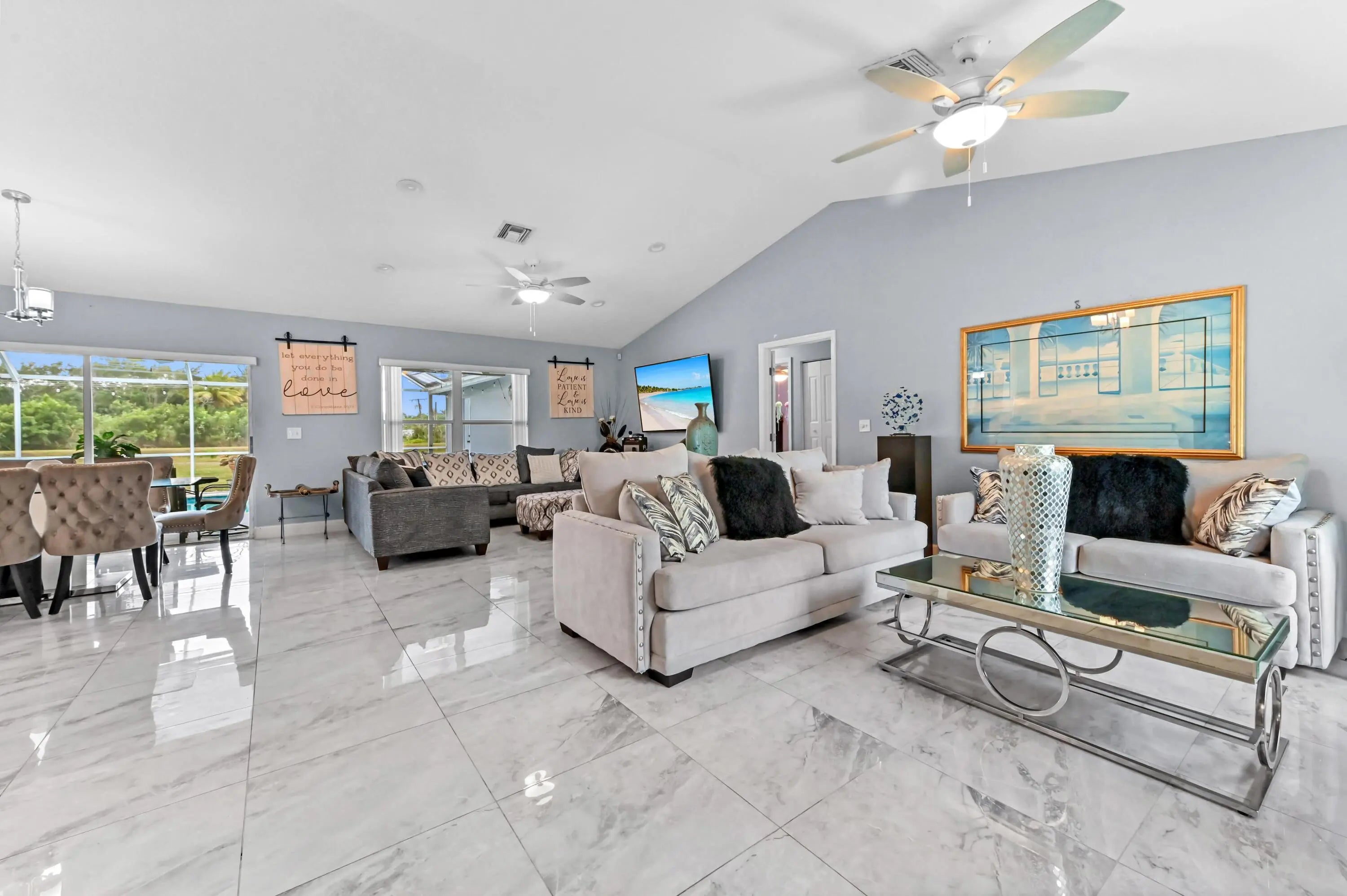 Step into a residence defined by volume and light, where soaring vaulted ceilings and high-gloss marble-look tile flooring create an immediate sense of grandeur. The expansive open-concept living and dining areas are bathed in natural light, offering a seamless flow perfect for entertaining or relaxed daily living.35 Solar Panels cover about 80% of the electric bill! Seller willing to offer credit towards closing costs.