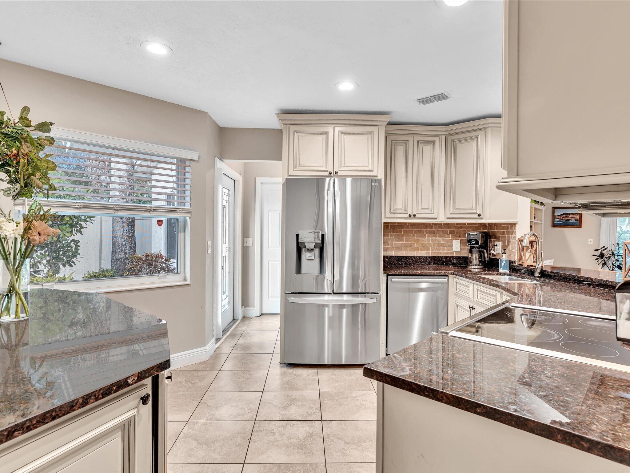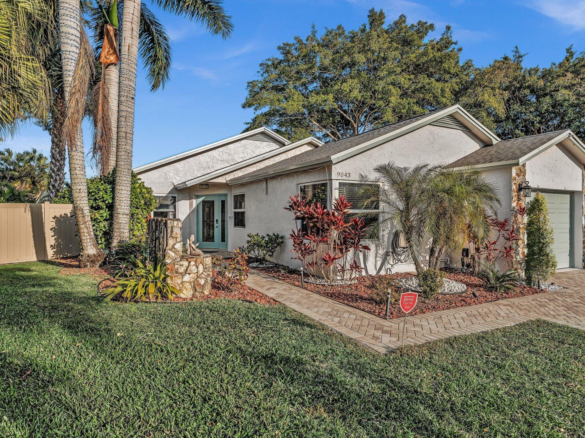 This one checks every single box! Absolutely charming home perfectly positioned on the cul de sac in Boca Fontana. The backyard, equipped with a vacation-style oversized lake view, is captivating! Homeownership will be stress free with a Brand New Roof, Full Impact Protection, new HVAC with UV-C Light Air Purifier and a Water Softener. Triple split floorplan allows personal space for everyone. The Primary features an en-suite Bath that has been completely renovated, sliding doors to the screened patio, and a custom walk in closet. Updates continue throughout with porcelain tile, newer Stainless Steel appliances, fresh exterior paint, herringbone paver driveway, and various fruit trees too. Excellent schools, many shops and restaurants nearby, here is your chance to live your Boca dream!