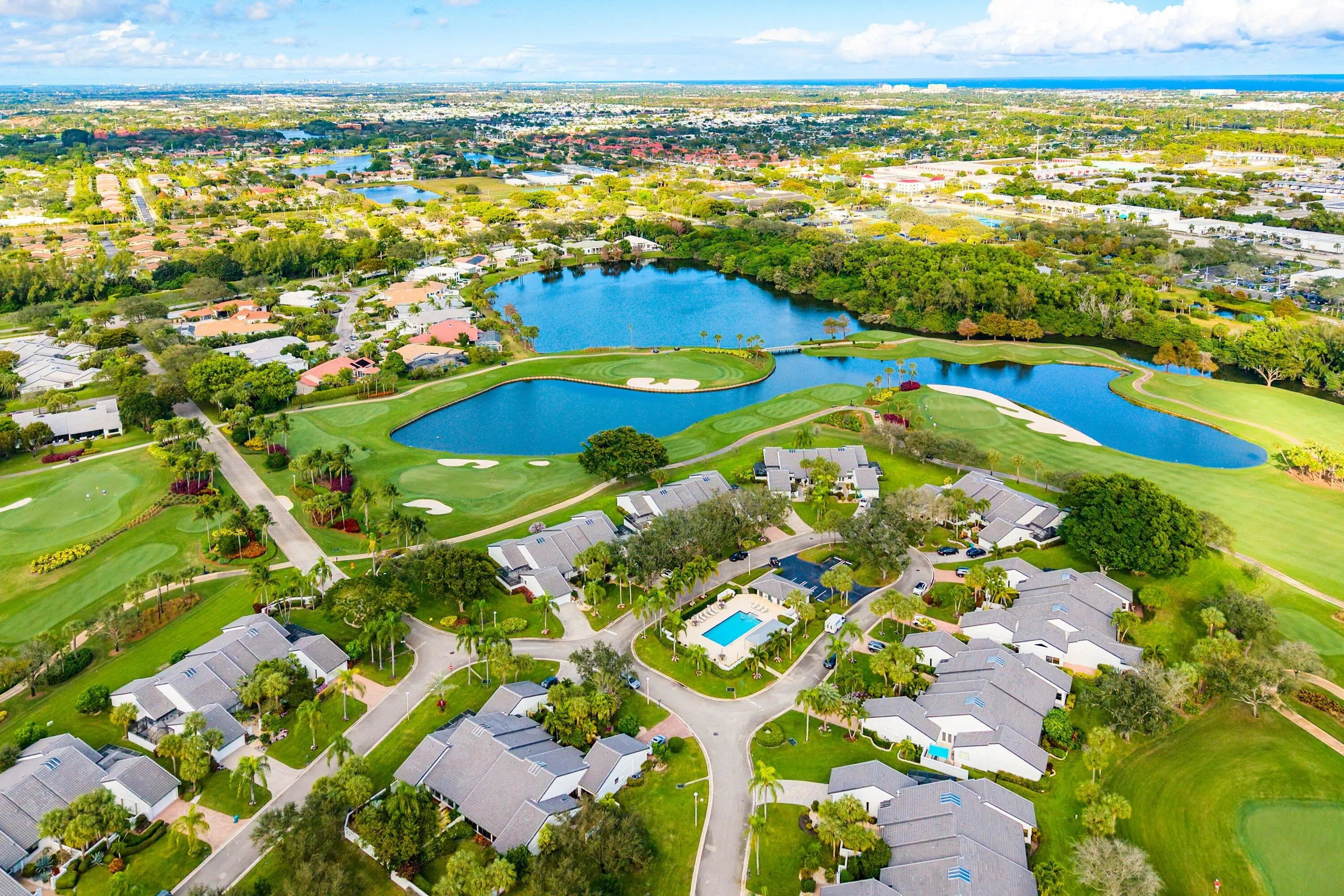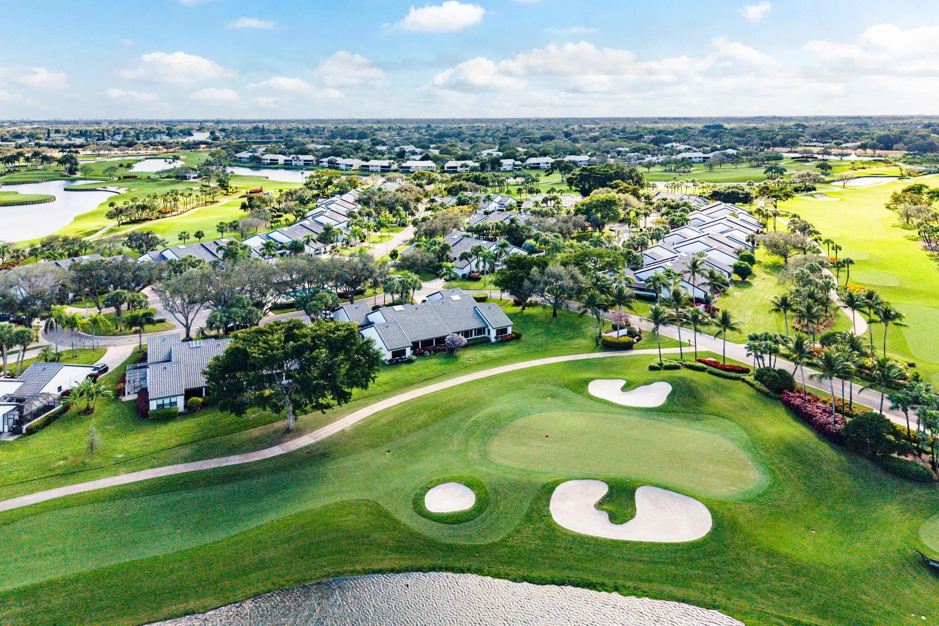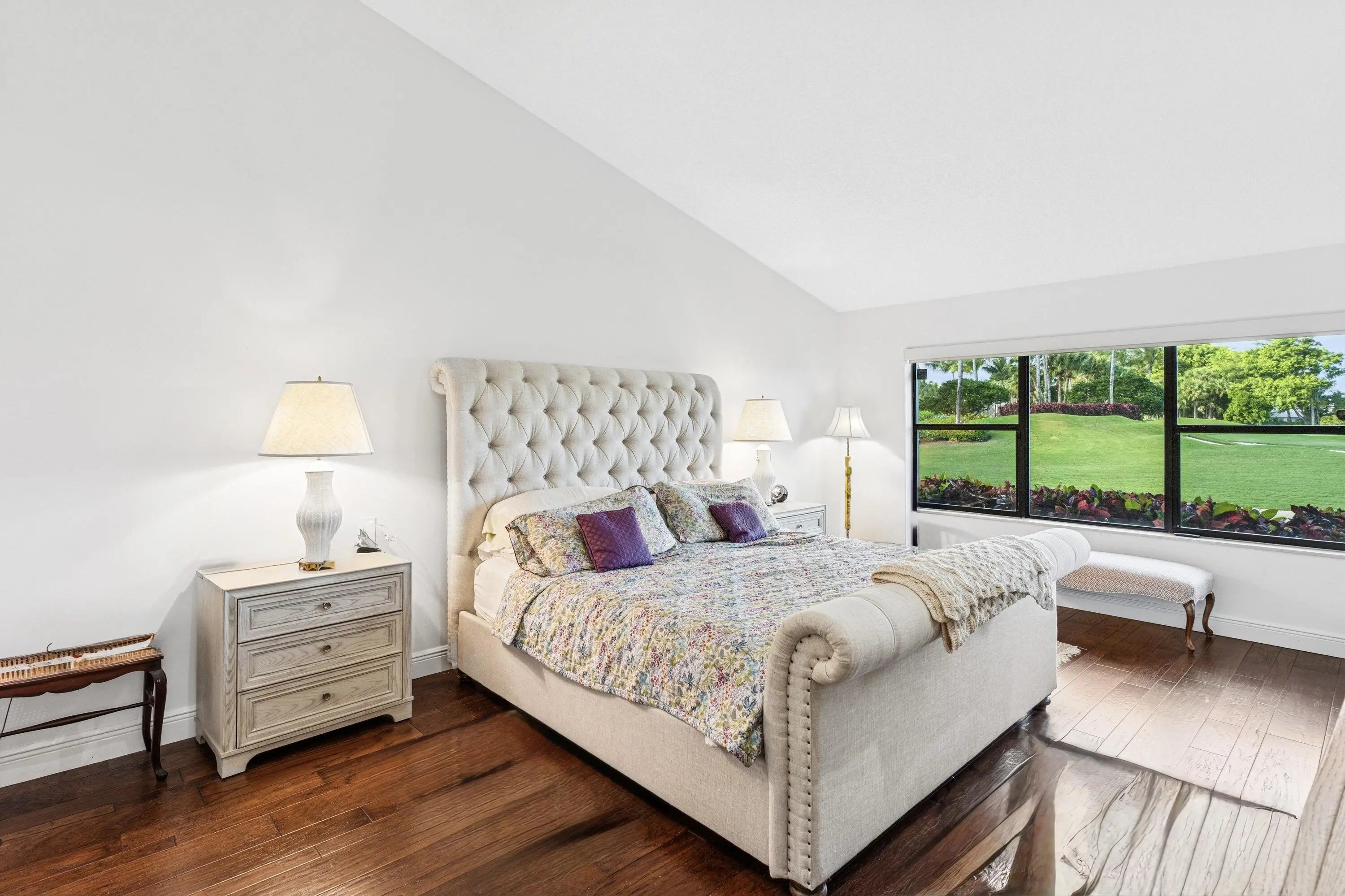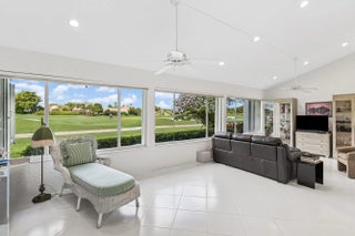 Villas of Windsor is among Hunters Run's most exclusive enclaves, prized for the most spacious villa floor plans and panoramic golf-and-water views. At 71 Windsor Circle, dramatic vistas of the East Course and shimmering lakes pair with 22' cathedral ceilings and a skylight that fills the home with natural light. Offering 2,600+ SF, the spacious layout includes an enclosed Florida room under A/C and a screened atrium for effortless indoor-outdoor living. The primary suite features an updated bath with high-end fixtures in transitional style. The split-bedroom layout provides a guest bedroom, convertible den, full bath, and powder room. The eat-in kitchen has been updated with solid wood cabinetry, granite counters and stainless appliances. Relax at the Windsor Pool, steps from your door.