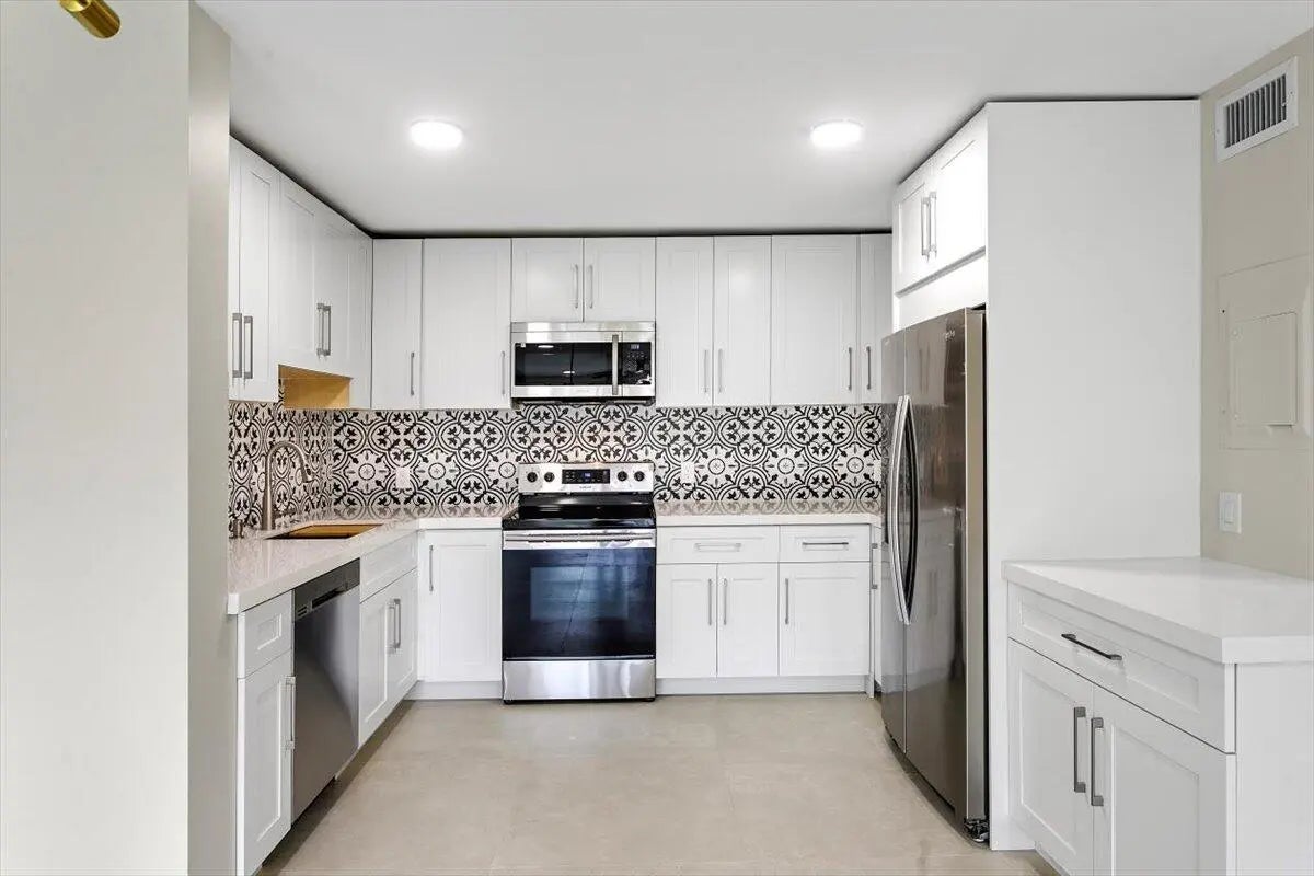 Welcome to Waterside Village, a beautifully maintained, gated community offering a relaxed, resort-style living experience. This rare first-floor end residence has been fully renovated and is move-in ready, providing a comfortable and stylish setting to enjoy South Florida living. The light-filled interior features 3 bedrooms and 2 baths, complemented by 32x32 porcelain tile flooring throughout. The reimagined kitchen showcases quartz countertops, shaker-style cabinetry, a designer backsplash, and stainless-steel appliances, along with a dedicated laundry room with a full-size washer and dryer. Additional highlights include accordion shutters, a newer A/C (2017), water heater (2021), and a private exterior storage closet conveniently located just outside the unit.