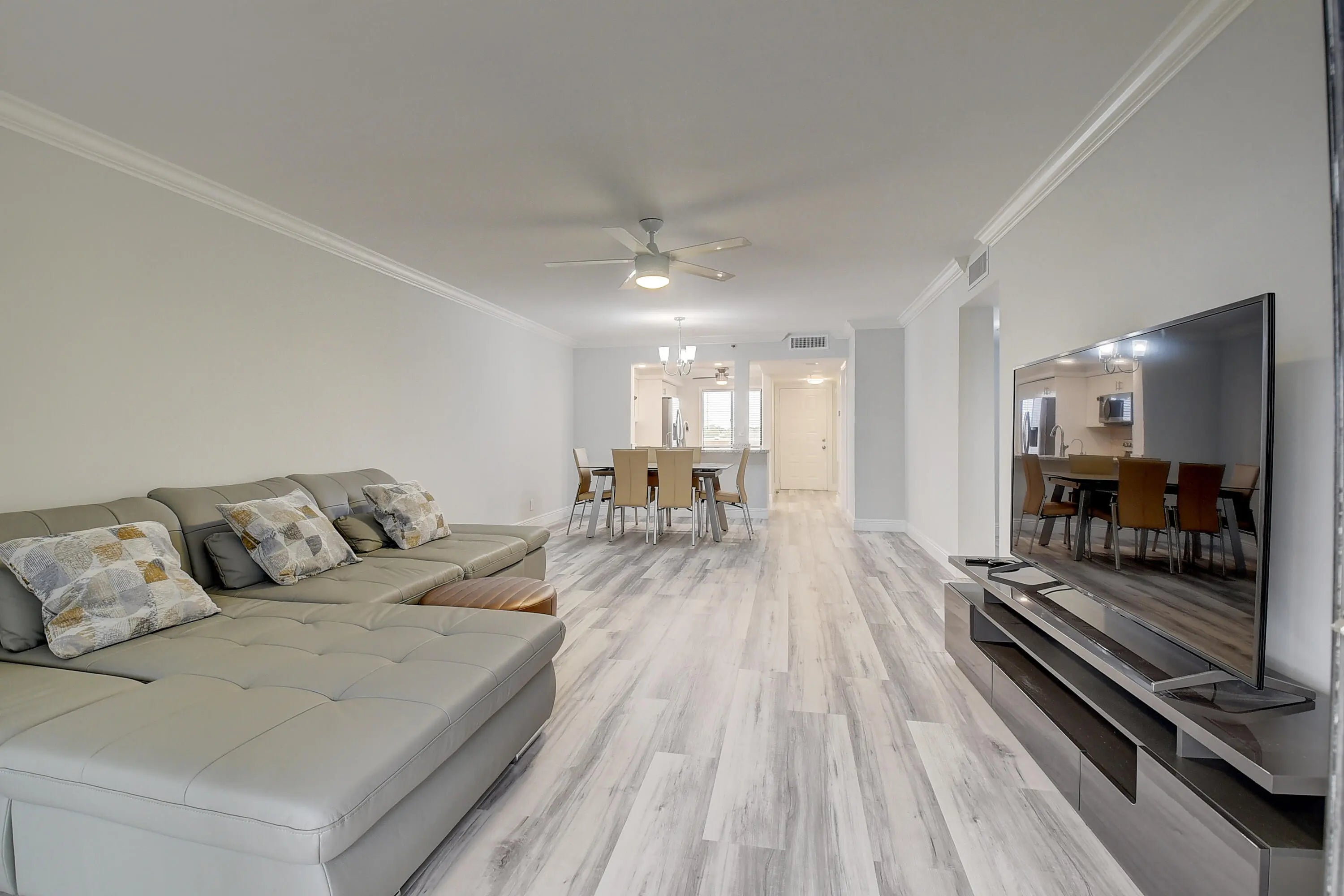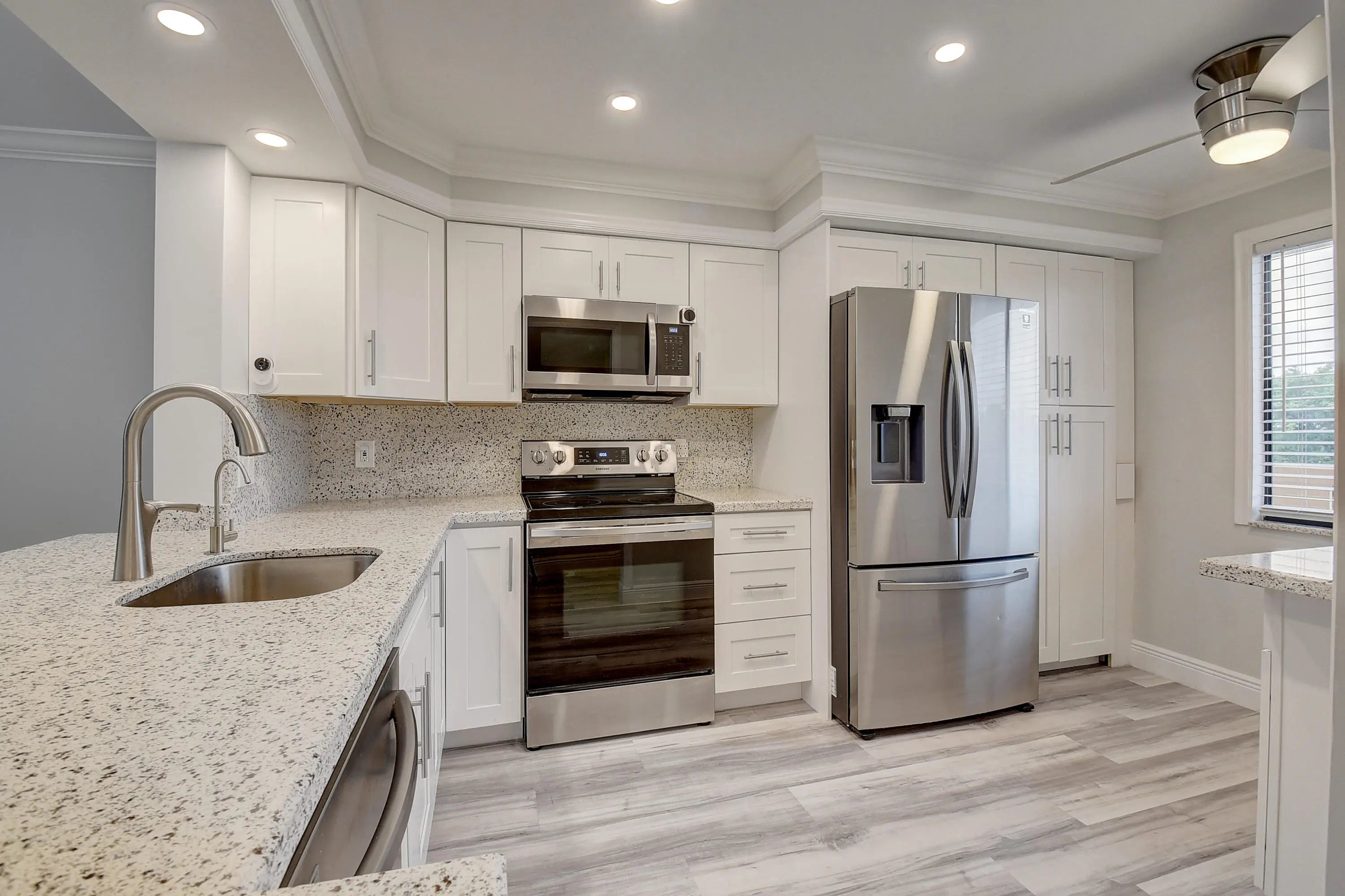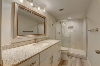 Completely renovated unfurnished 2 bedroom/2 bathrooms Lancaster model unit in desired active 55+community of Huntington Lakes. Enjoy gorgeous lake views from Primary Suite and the enclosed lanai with accordion shutters. Open concept new kitchen with white shaker cabinets and quartz countertop and backsplash, new Samsung SS appliances with full warranty, recessed ceiling LED lights. New beautiful 100% waterproof vinyl plank throughout entire condo, no popcorn, exquisite crown-molding and raised baseboards. Master suite with 2 spacious walk-in-closets. LED fan in every room. Separate laundry room with new Samsung W/D. All hardware and doors are new, as well as bathroom vanities, fixtures, frame-less Kohler shower doors. Call now to tour this unit!