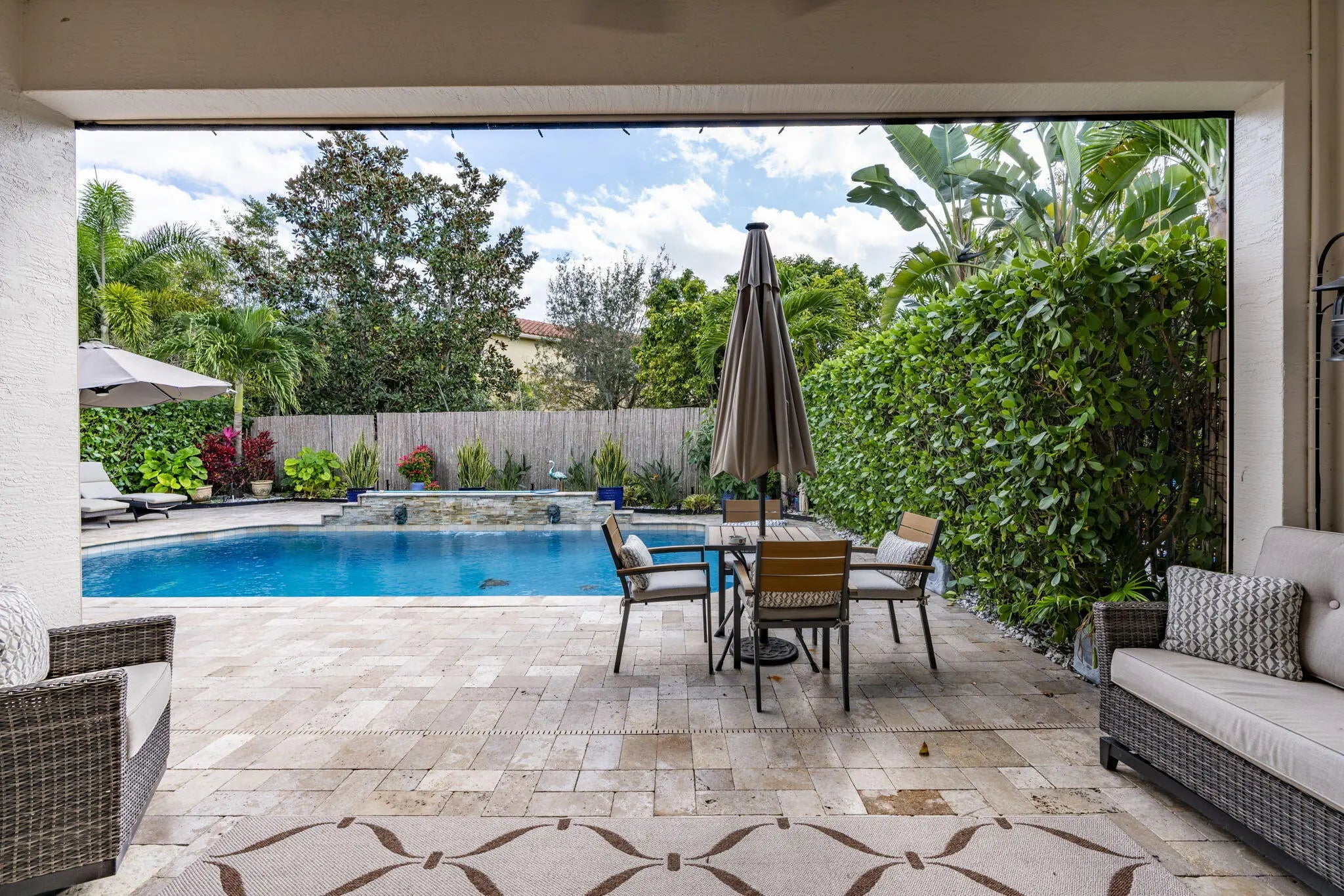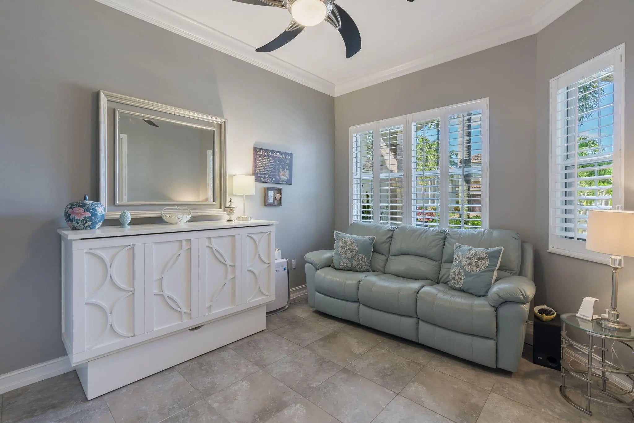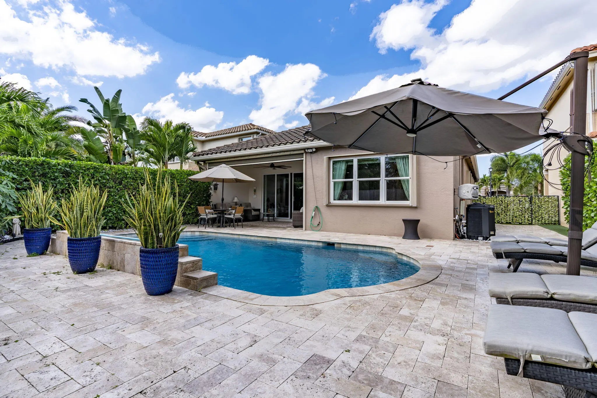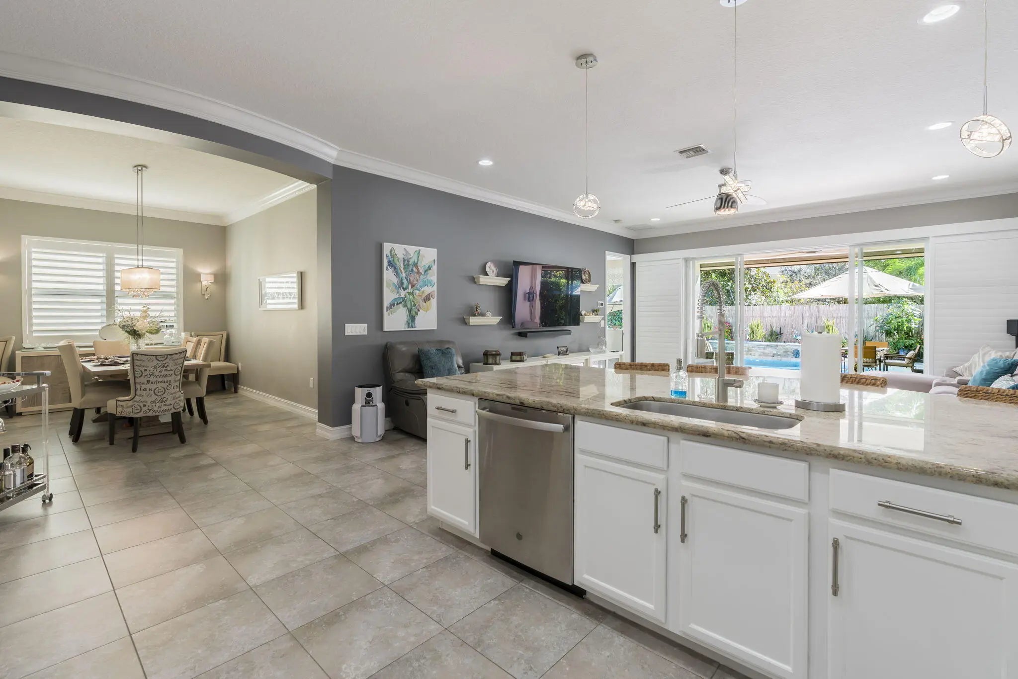 This one-story pool home in Boynton Beach is simply beautiful. This Updated 2 bedroom, 2 Full-bathrooms with bonus room that could easily be turned into a third-bedroom rancher, has an open floor plan that really flows. The kitchen is the heart of the home with the extra large island that opens up to the heated saltwater pool. The oversized primary bedroom has custom closets with updated tile flooring. The walk-in shower is updated. The second bedroom is a generous size with custom closets as well. All appliances are less than 5 years old. In Kitchen you will find GE PROFILE. Custom paint interior and exterior recently done. Whole house water filtration system and beautiful crown molding throughout home. Custom wall to wall built-in, found in the bonus room.