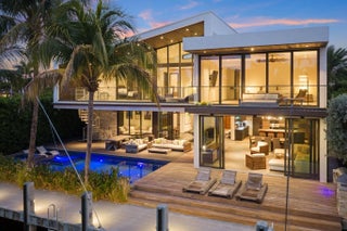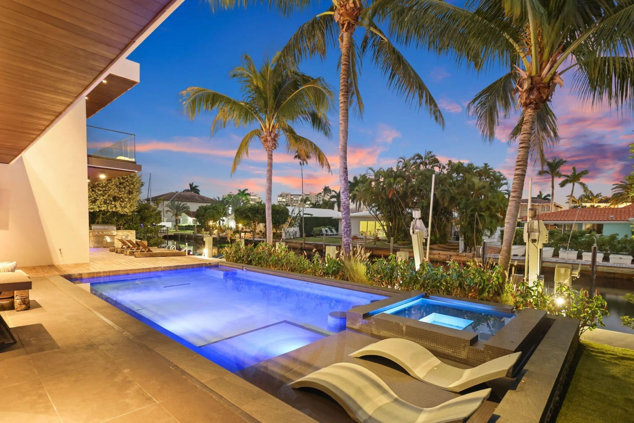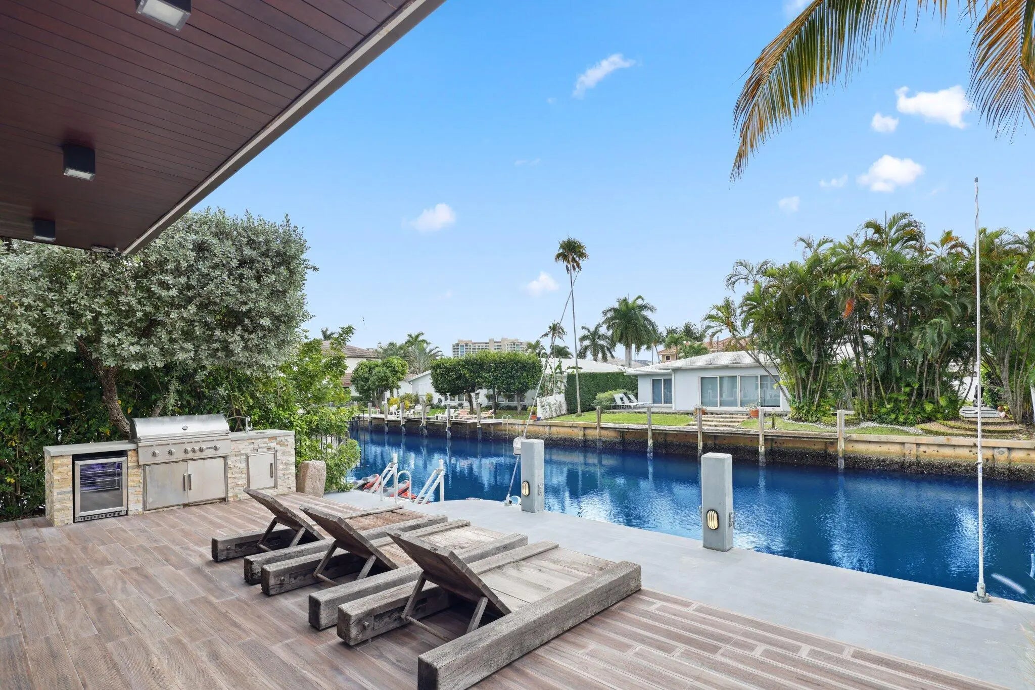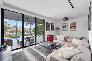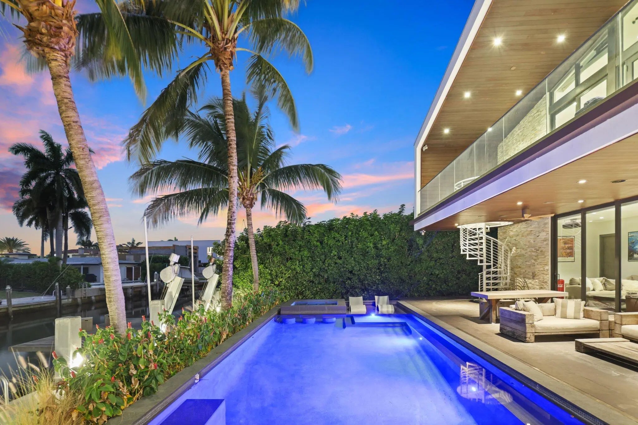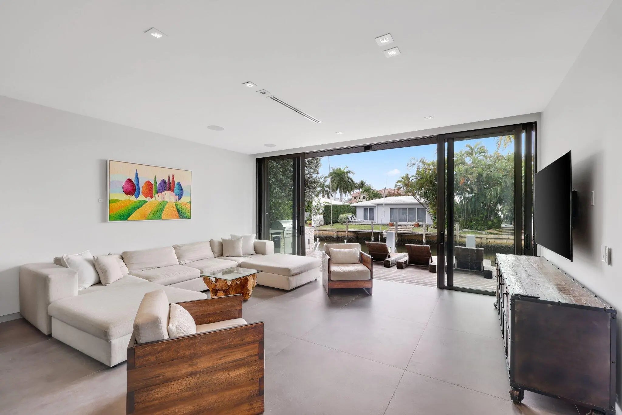 Stunning contemporary 5-bedroom + office waterfront residence offering true boating freedom with no fixed bridges to the Intracoastal Waterway. Upon entry, a dramatic great room with soaring vaulted ceilings and floor-to-ceiling glass creates an immediate sense of scale and light, framing views of the tropically landscaped pool, patio, and canal beyond. The open-concept layout seamlessly connects the kitchen, dining, and family/media areas, ideal for both everyday living and entertaining. Chef's kitchen with a large center island with seating for five, Wolf & Sub-Zero appliances, built-in wine storage, beverage drawers, & ice maker. The first-floor ensuite bedroom is currently configured as a media room overlooking the pool and