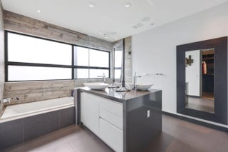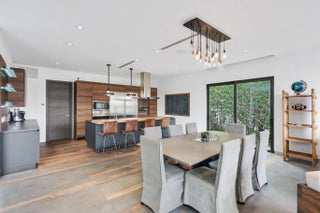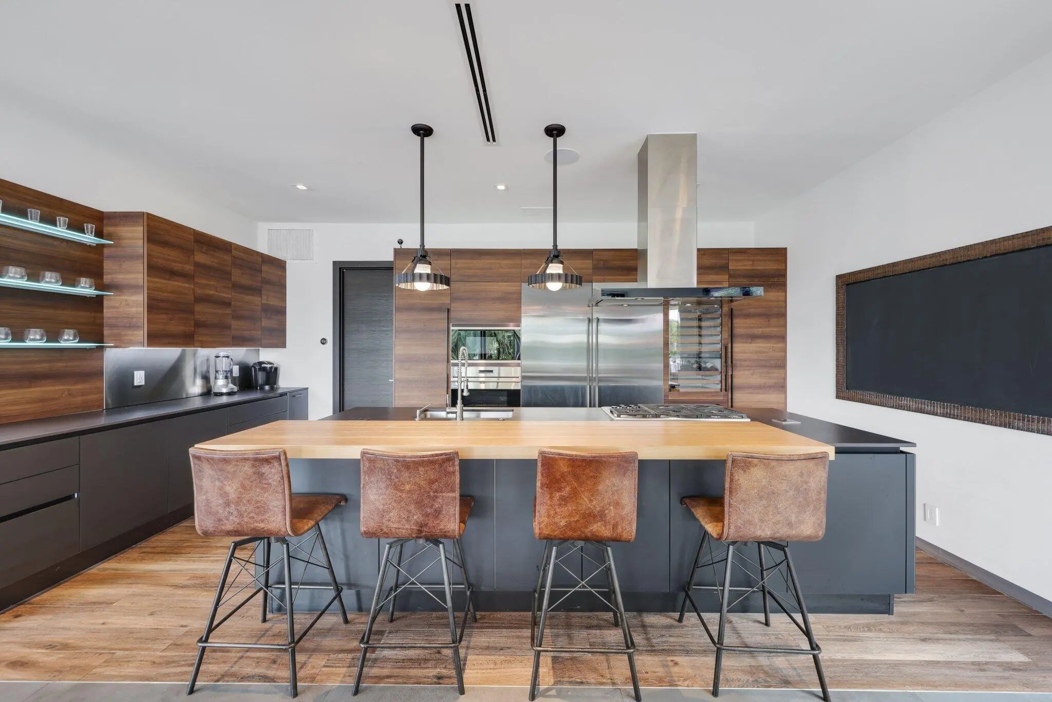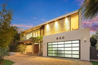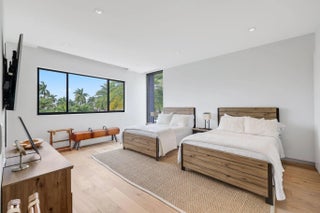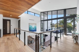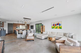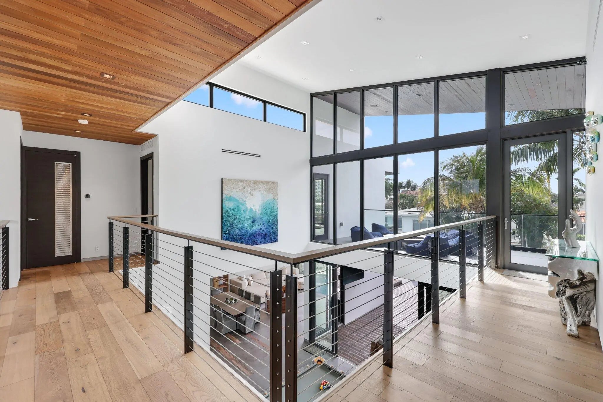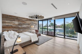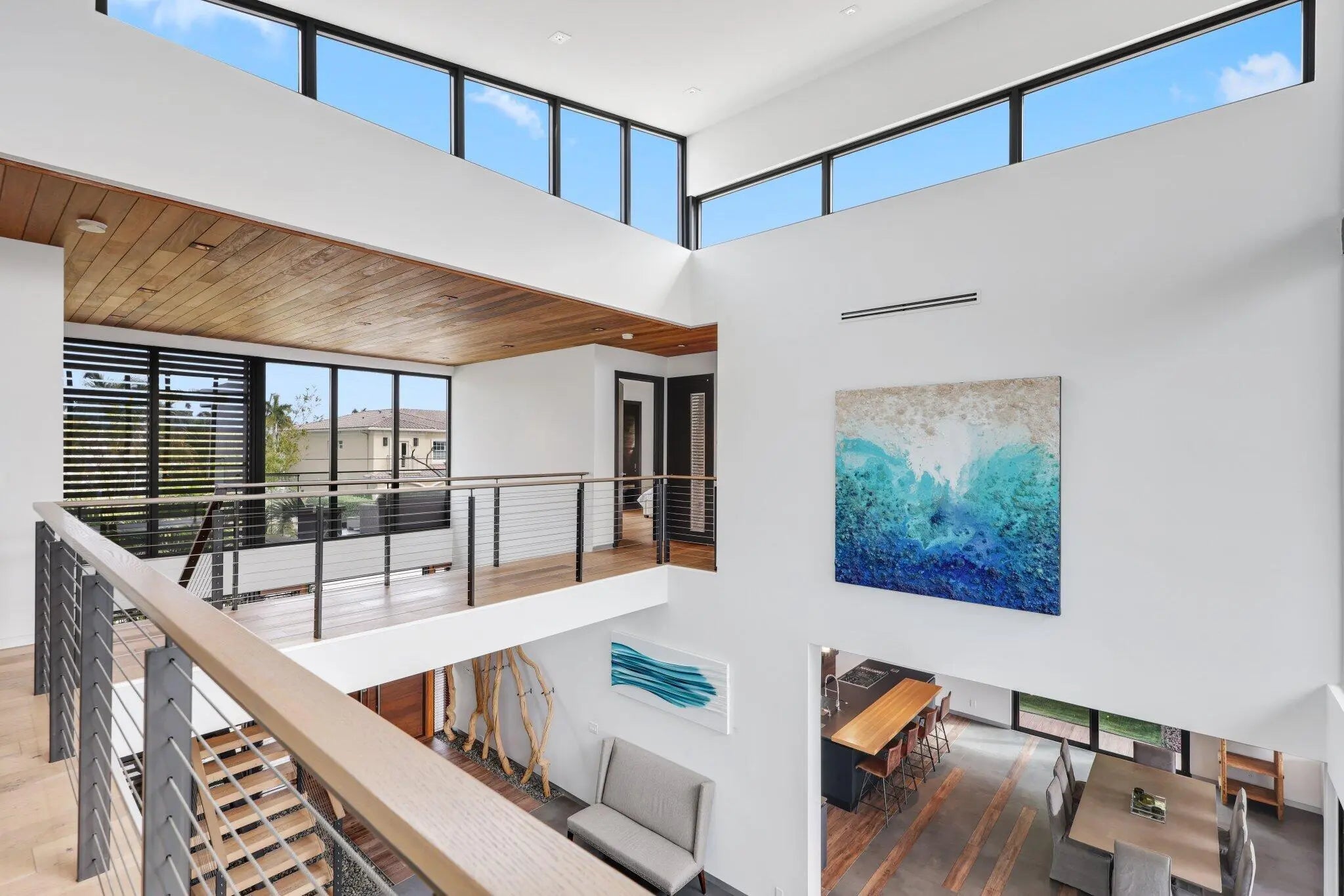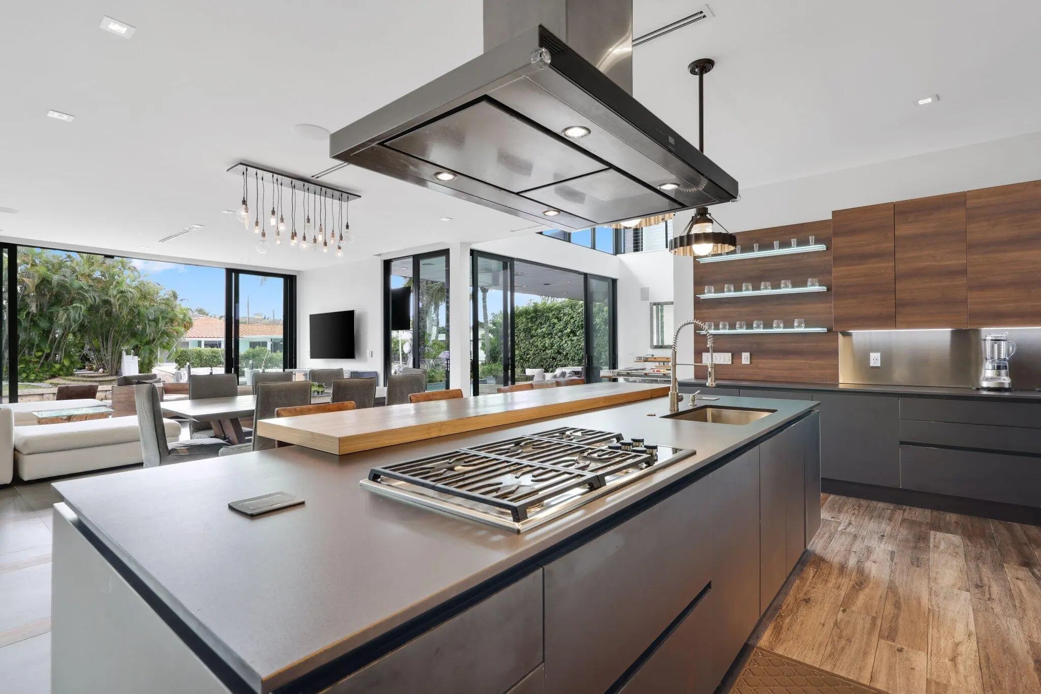 Stunning contemporary 5-bedroom + office waterfront residence offering true boating freedom with no fixed bridges to the Intracoastal Waterway. Upon entry, a dramatic great room with soaring vaulted ceilings and floor-to-ceiling glass creates an immediate sense of scale and light, framing views of the tropically landscaped pool, patio, and canal beyond. The open-concept layout seamlessly connects the kitchen, dining, and family/media areas, ideal for both everyday living and entertaining. Chef's kitchen with a large center island with seating for five, Wolf & Sub-Zero appliances, built-in wine storage, beverage drawers, & ice maker. The first-floor ensuite bedroom is currently configured as a media room overlooking the pool and