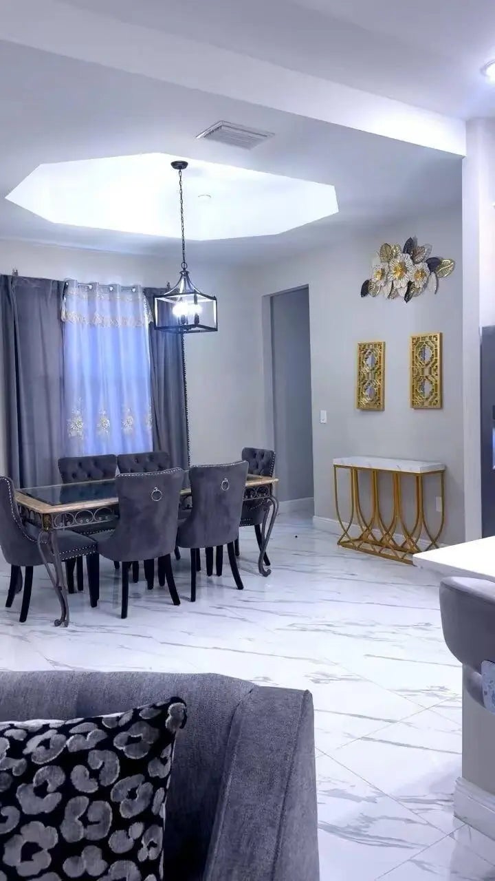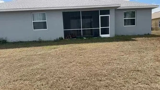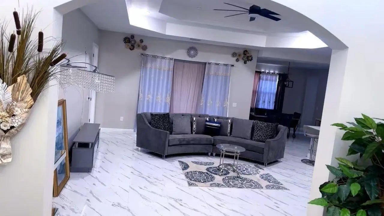 Beautiful 4‑bedroom, 3‑bath home featuring a bright open layout and modern designer finishes throughout. Enjoy elegant porcelain tile flooring, recessed lighting, custom tray ceilings, and a spacious living area perfect for entertaining. The gourmet kitchen offers quartz countertops, stainless steel appliances, a large island with seating, and soft‑close cabinetry. The luxurious owner's suite includes a spa‑style bathroom with a freestanding soaking tub, dual walk‑in showers with frameless glass, and two generous walk‑in closets. Additional upgrades include a screened front entry and rear patio, an enhanced well system, and upgraded electrical components. The private backyard provides plenty of room for a future pool or outdoor living space. Located in a