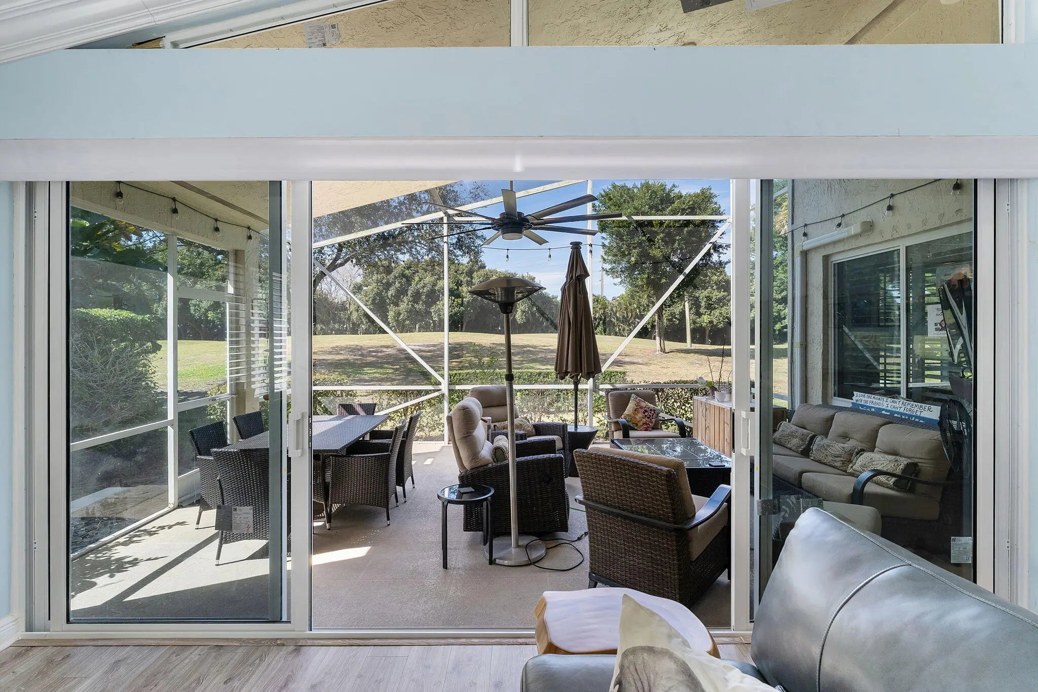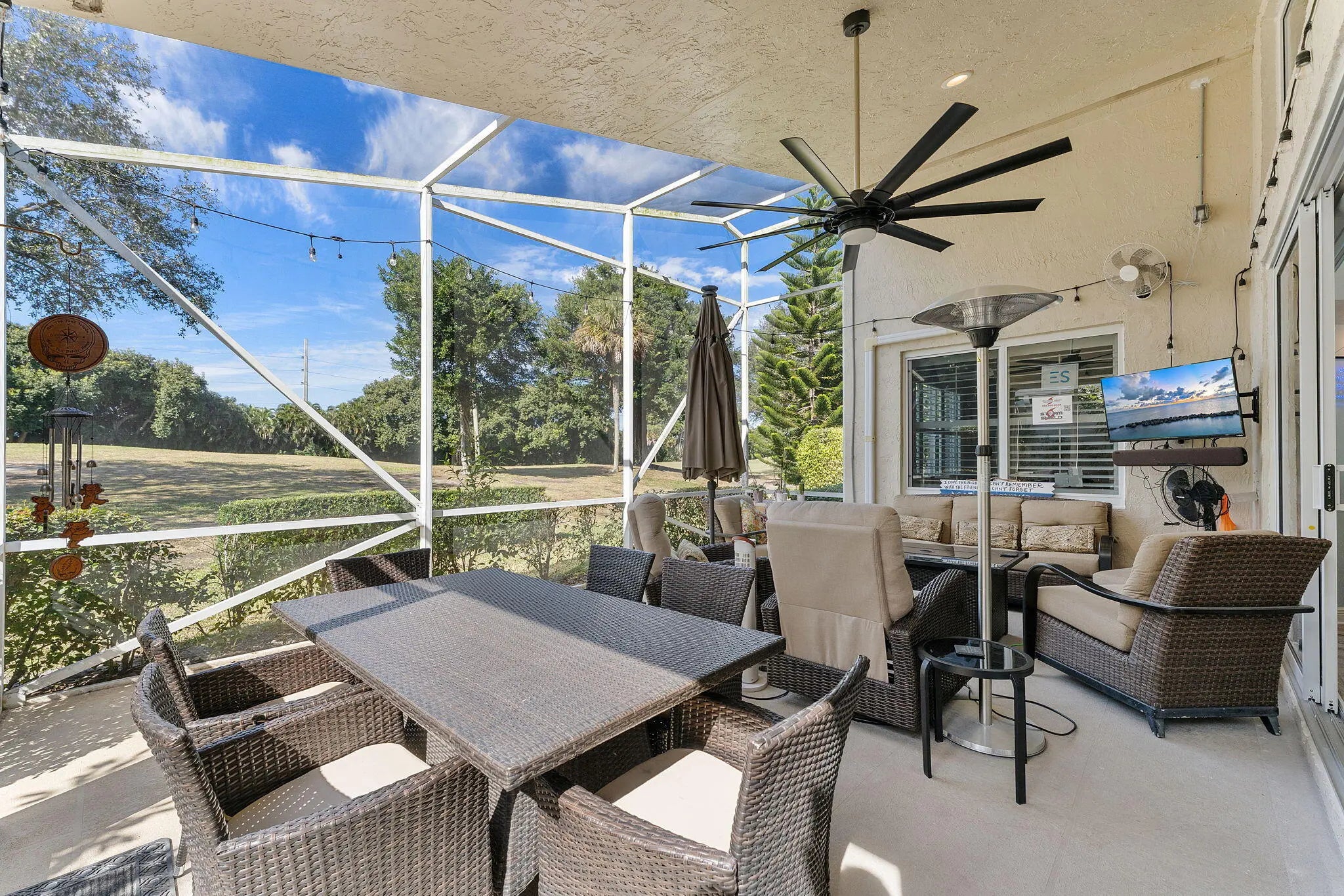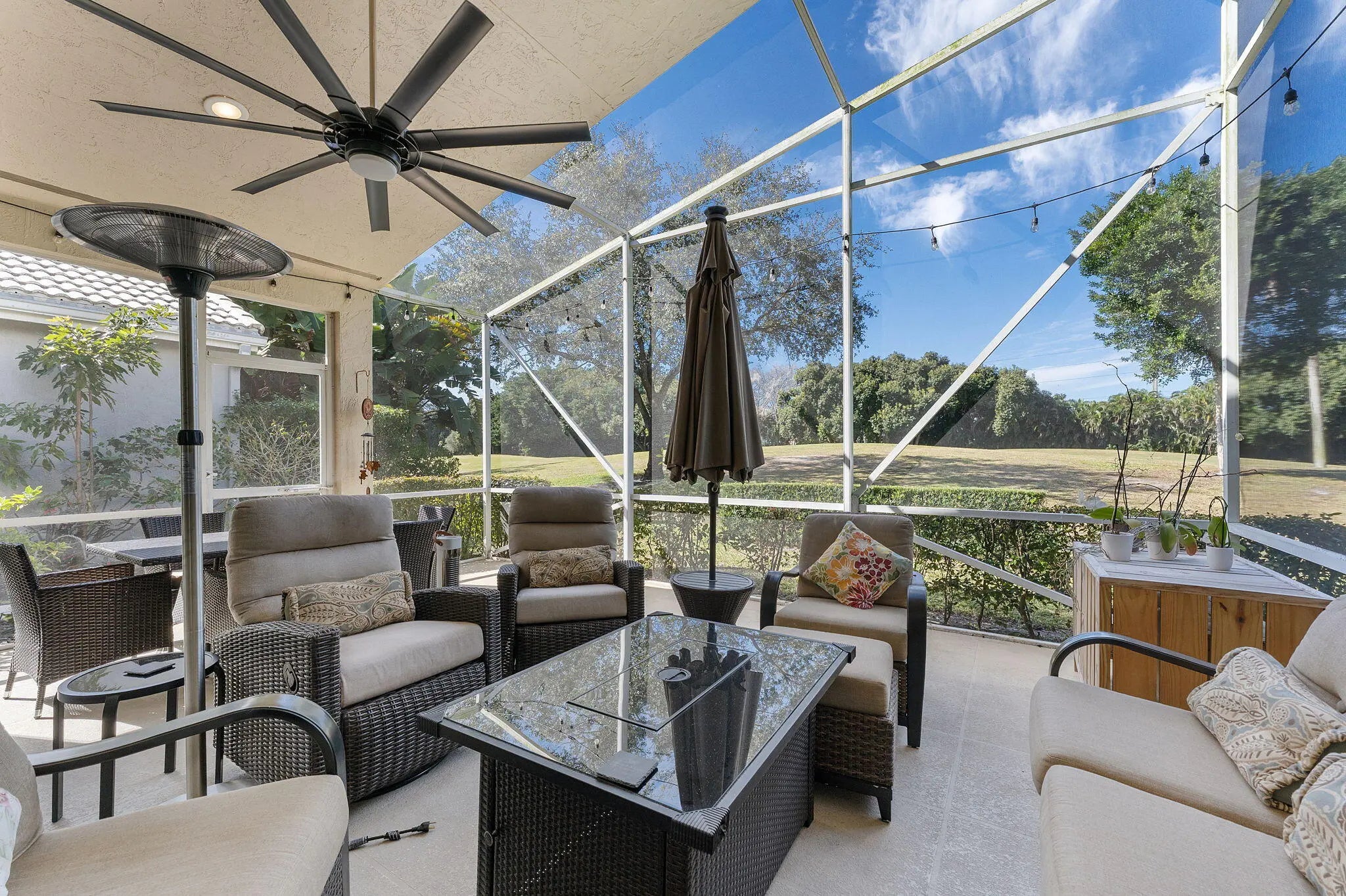 Live the Florida lifestyle in this updated 3-bed, 2-bath home with golf course views in the gated community of Hampton Fairways at Indian Spring. Thoughtfully redesigned, this home features an open floor plan ideal for everyday living and entertaining. Updates include new vinyl flooring, smooth ceilings, plantation shutters, and abundant natural light throughout. A custom live-edge epoxy resin bar creates a striking focal point. The kitchen offers updated appliances and custom shelving, while both bathrooms have been fully renovated with contemporary finishes. The spacious primary suite includes a spa-like ensuite. Enjoy the screened lanai overlooking golf views. Impact windows and a hurricane-rated garage door provide peace of mind. Pet-friendly community with pool. Optional Membership.
