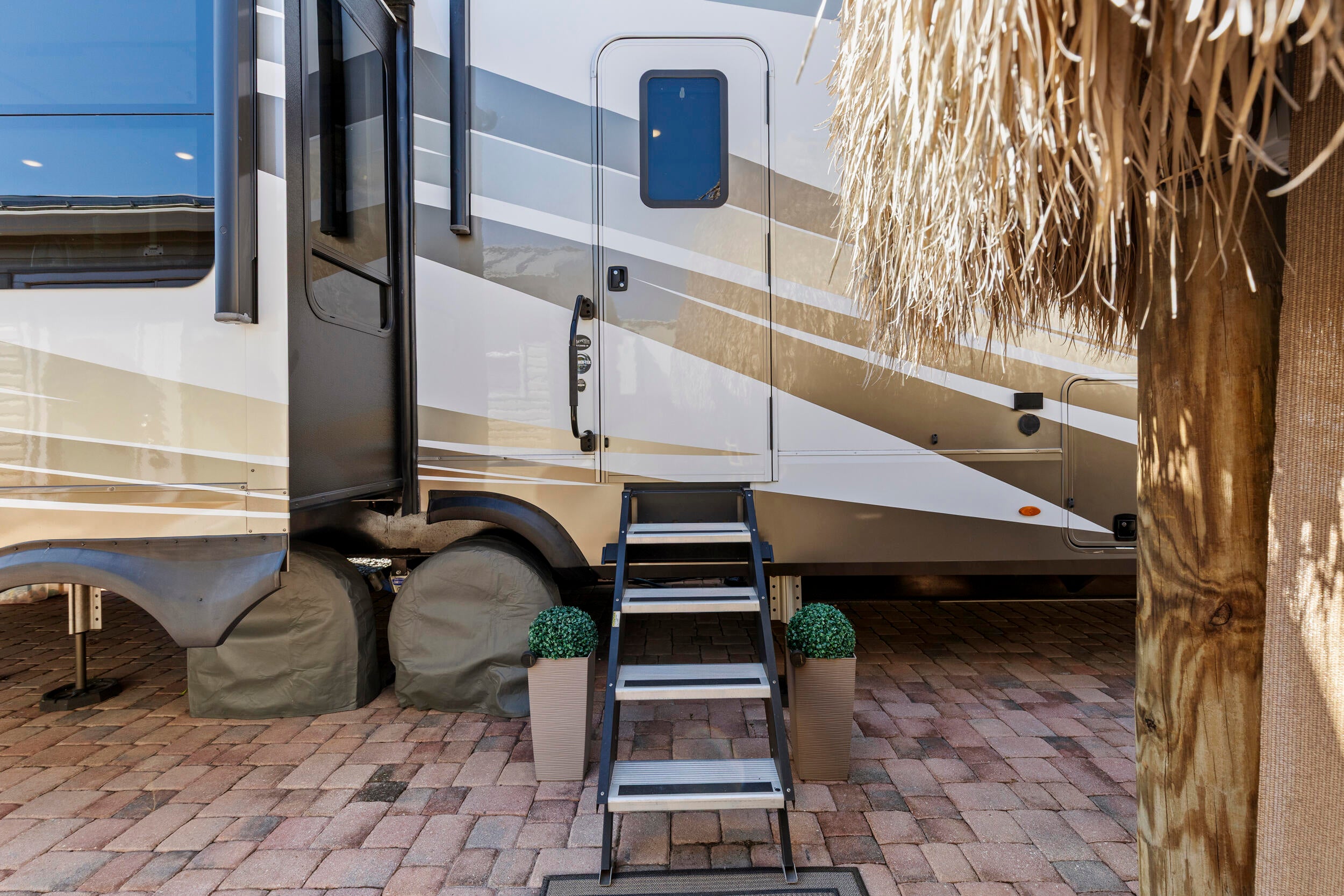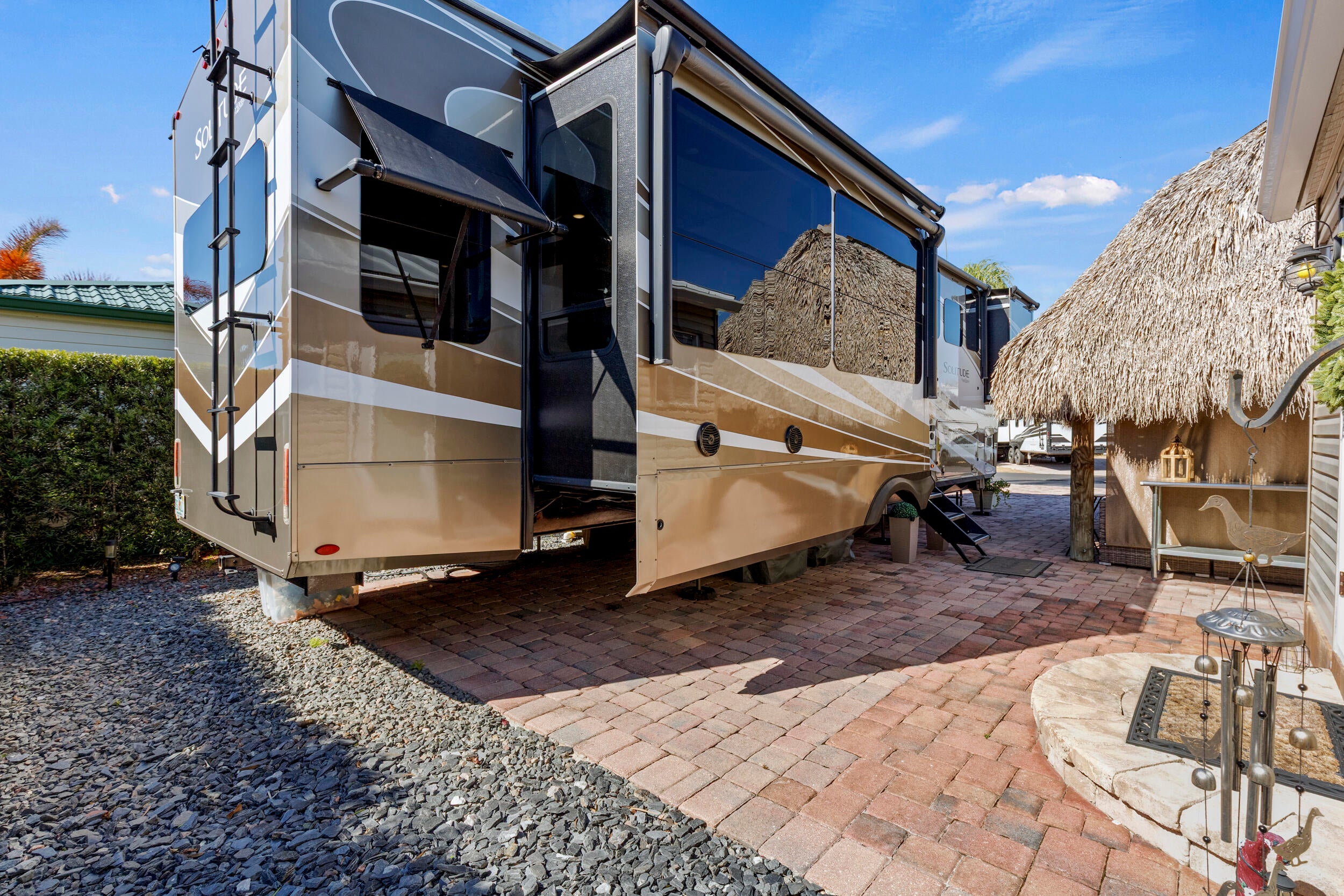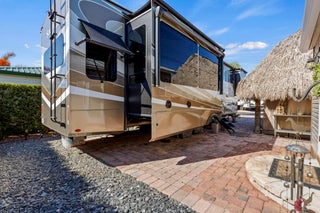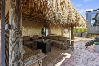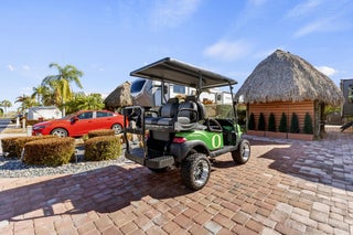 Enjoy 55+ resort-style living at the highly desirable Silver Palms 5-Star RV Resort, offering endless activities and a true getaway atmosphere. This well-maintained lot features a paver driveway, sprinkler system, and hardwired landscape lighting, creating a polished and welcoming outdoor space. Relax or entertain under the 12x16 tiki hut with electric. The property also includes a 12x16 shed with A/C and a bathroom, furnished with a sleeper sofa and coffee table--ideal for guest space, hobby room, or additional storage. Perfect for bringing your own RV and customizing your setup while enjoying an already upgraded lot. Excellent opportunity for seasonal or full-time RV living in Okeechobee. Resort amenities include clubhouse, fitness center, pickleball, shuffleboard, basketball court,spa/hot tub, laundry facilities, park, recreation facilities, gated entry, and storage. HOA covers water, sewer, trash, and lawn care. Optional purchase: Seller may consider selling the RV and customized lifted gas golf cart separately for an easy, turnkey transition.
