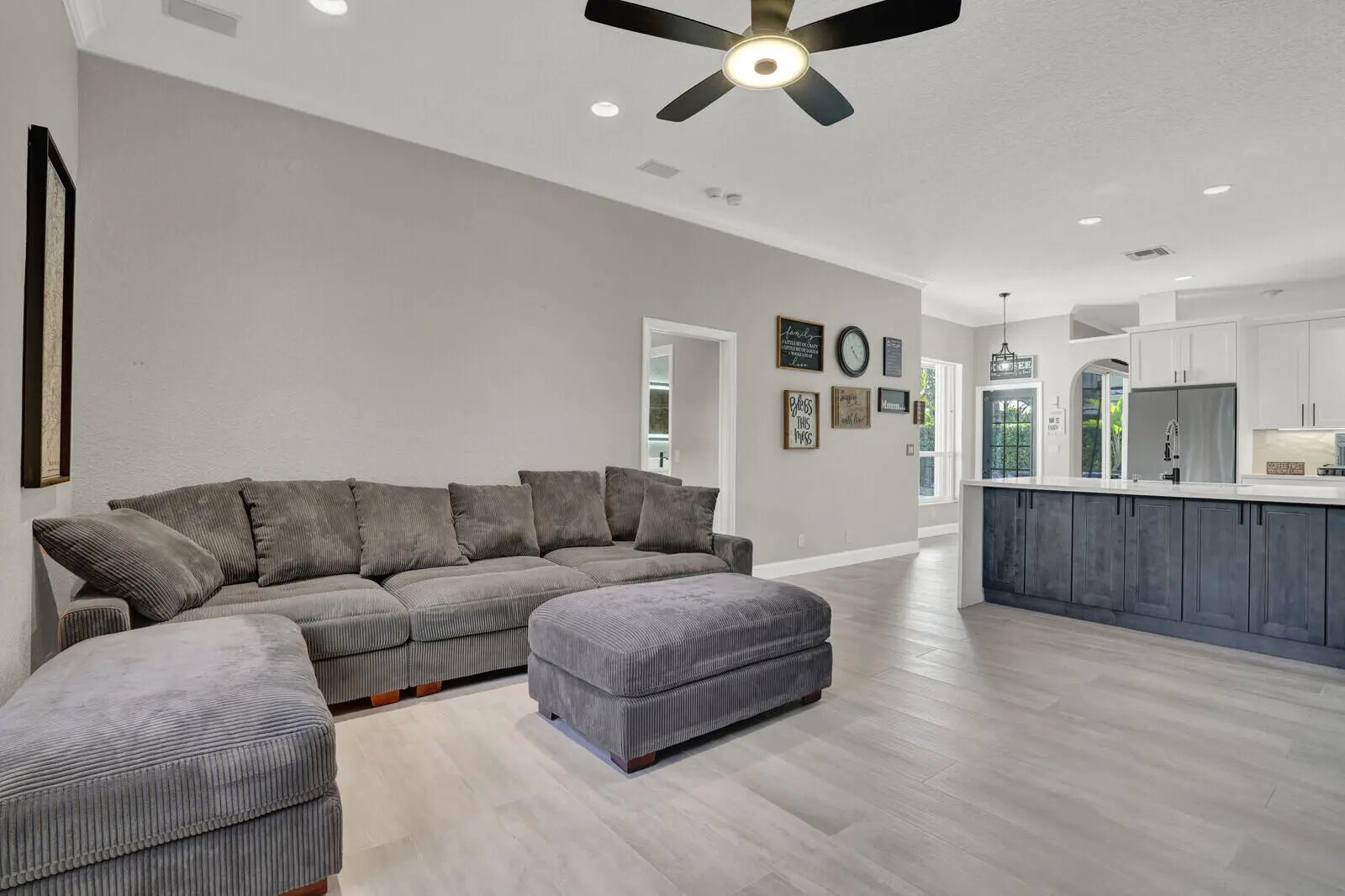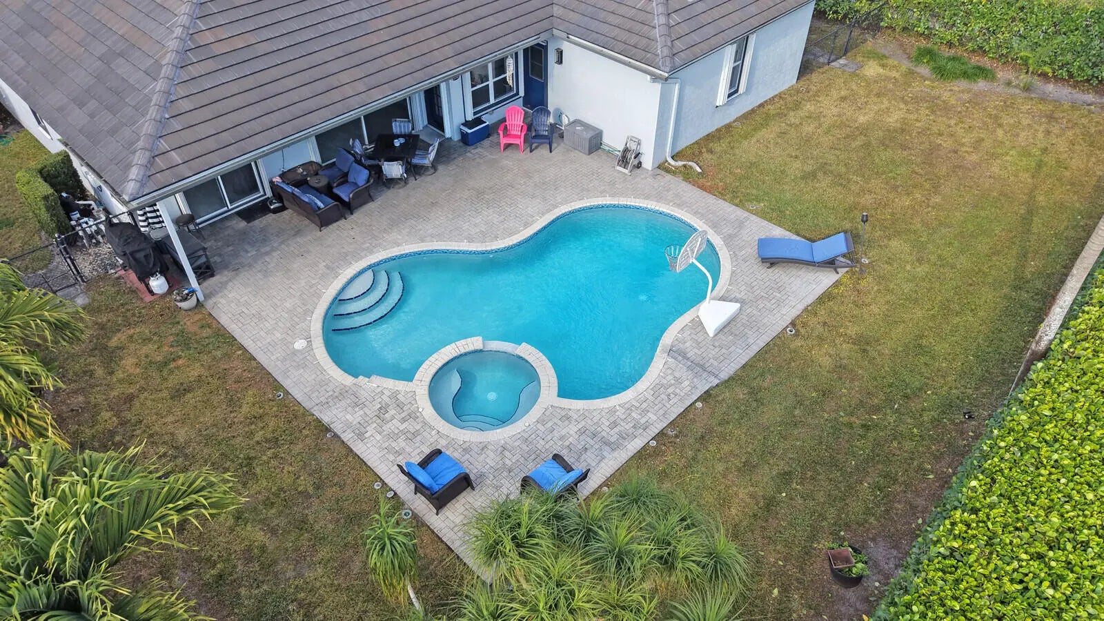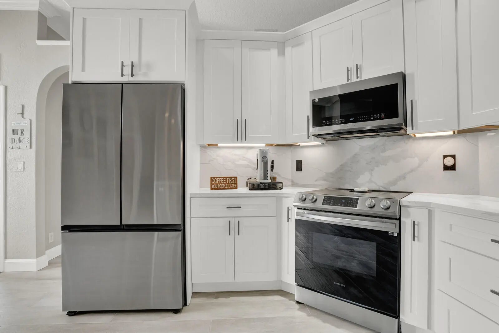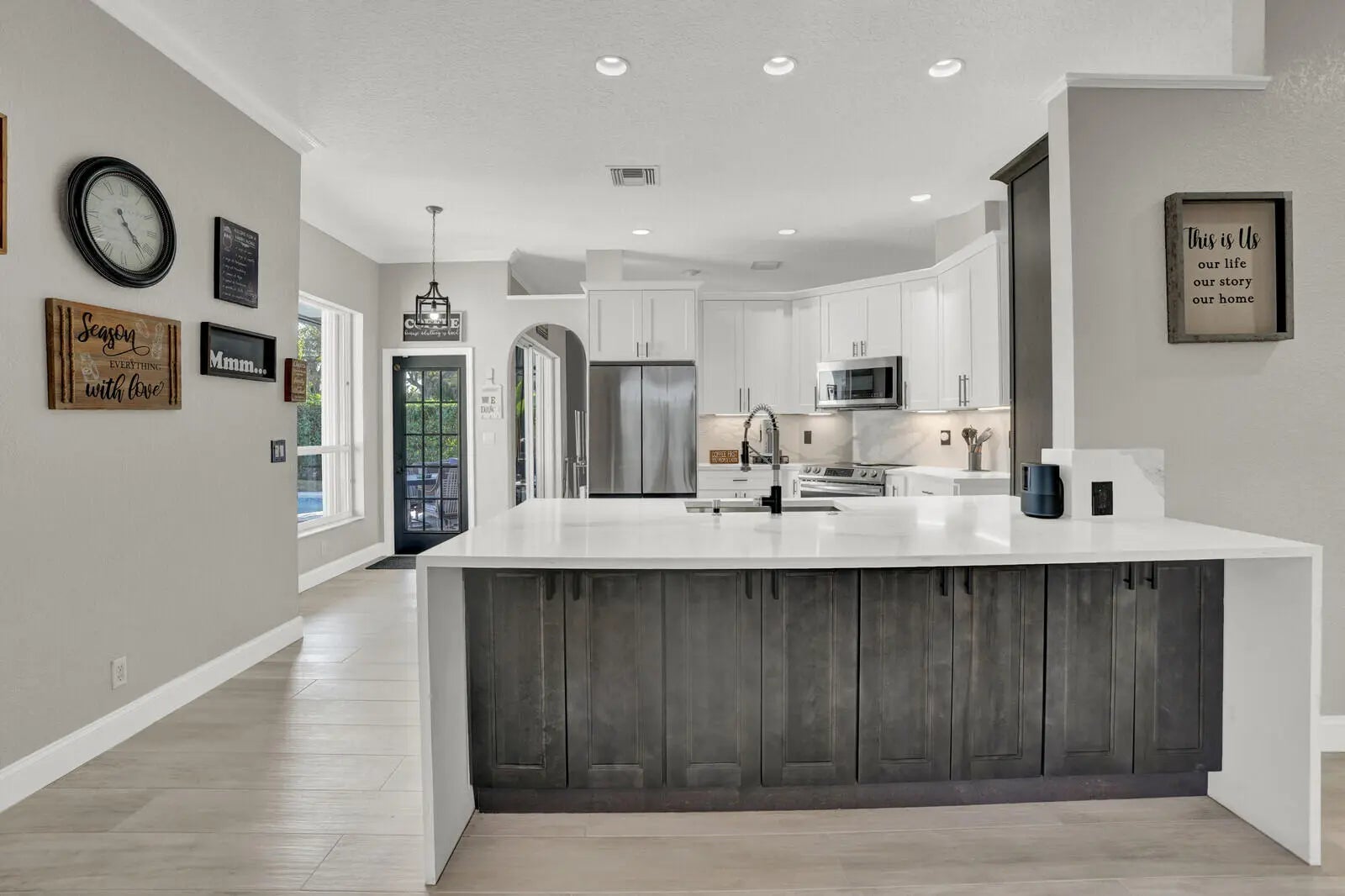 Absolutely stunning turnkey pool home with BRAND NEW upgrades throughout! Brand new roof, brand new floors, brand new pool finish and kitchen showcasing new Calcutta quartz countertops with DOUBLE waterfall edges, sleek white cabinetry, stainless steel appliances, designer backsplash, and a spacious island PERFECT for entertaining.Bright, open floor plan featuring elegant tile flooring, soaring ceilings, and a pool with a built in hot tub making this the kind of backyard you never want to leave.