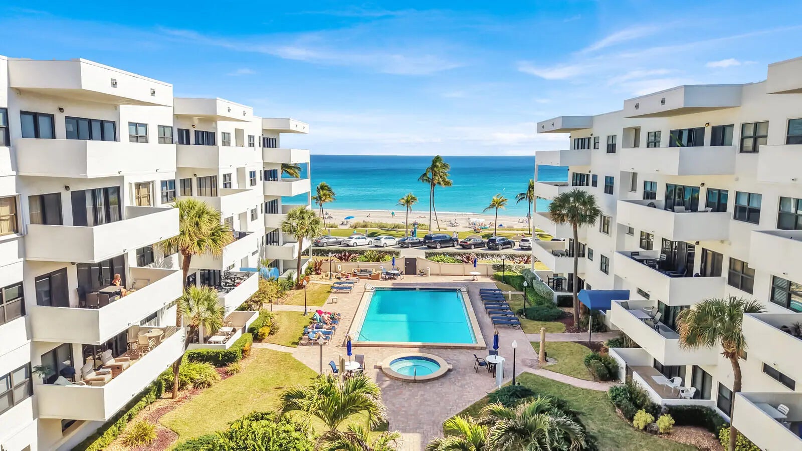 Experience coastal living at its finest from this beautifully updated northwest corner residence at Beach House in Deerfield Beach. This light-filled condo offers sweeping ocean and pool views from a spacious private balcony a" the perfect setting for morning coffee, sunset cocktails, or entertaining guests.Inside, the thoughtfully designed layout features a generous primary suite plus a flexible den, two full bathrooms, and elegant French doors. Fine tile flooring runs throughout, complementing the updated kitchen with granite countertops, stainless steel appliances, abundant cabinetry, and custom built-ins. A washer and dryer in the unit add everyday convenience.The building is financially and structurally sound with a new roof and all concrete restoration completed and fully paid a"