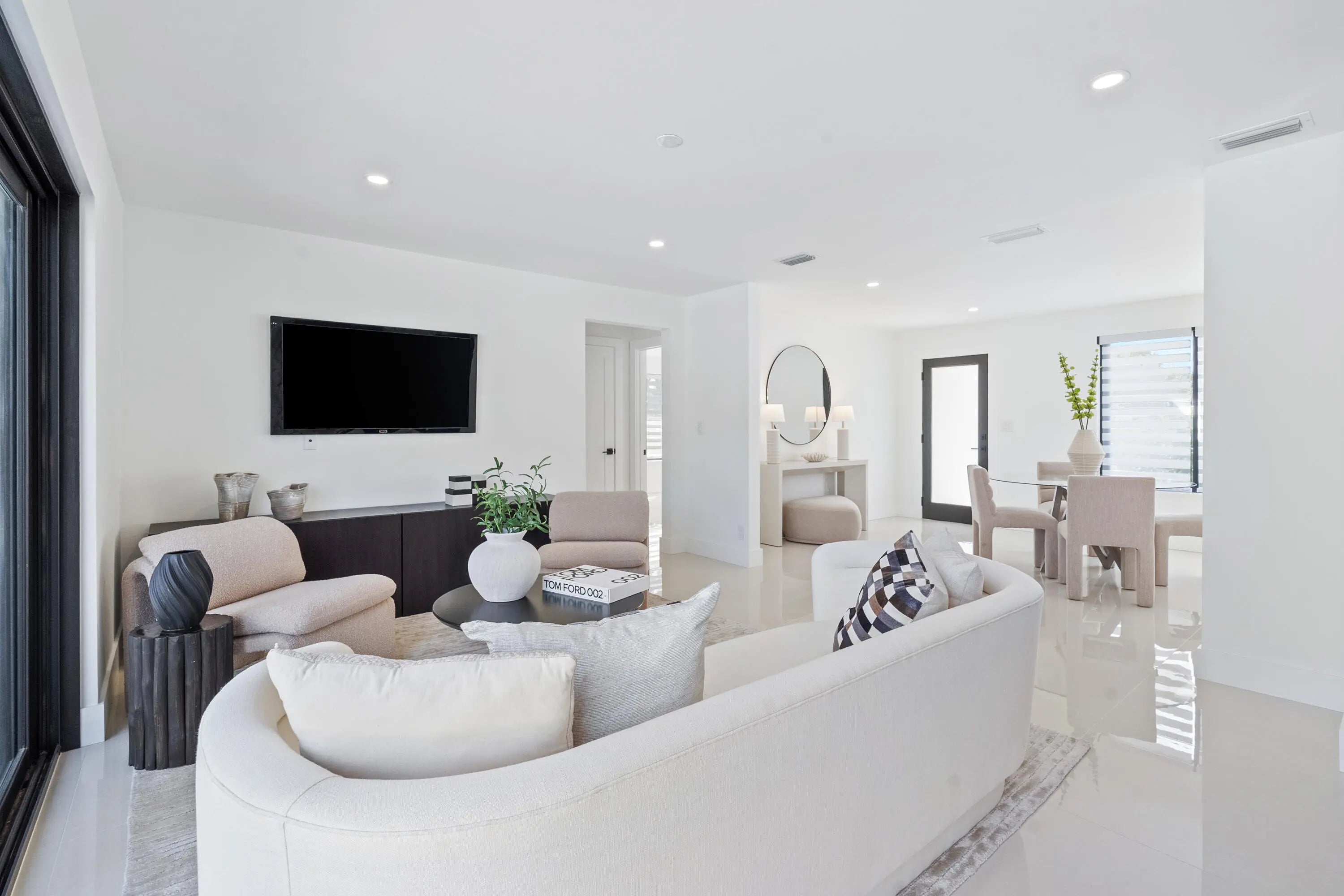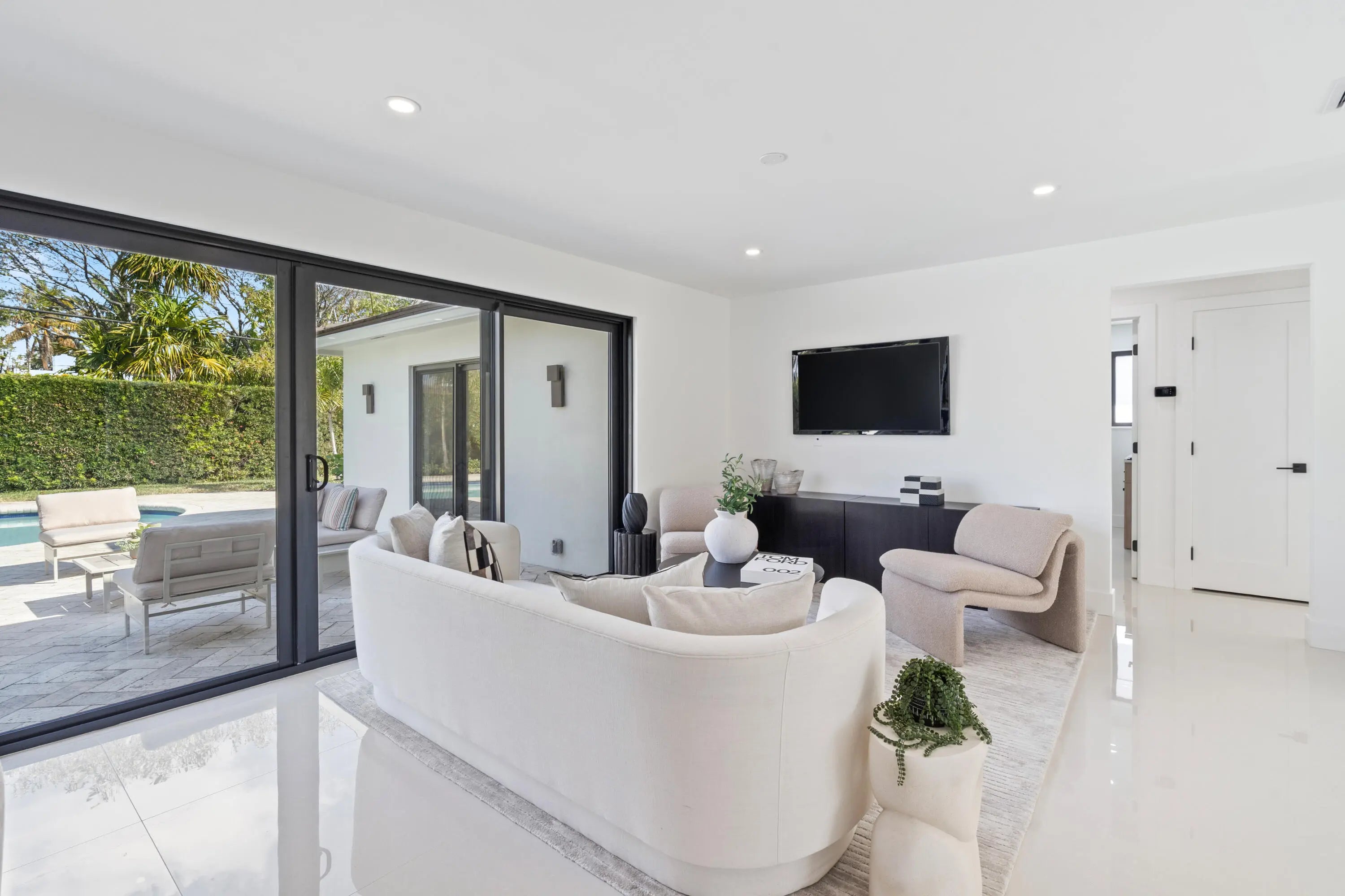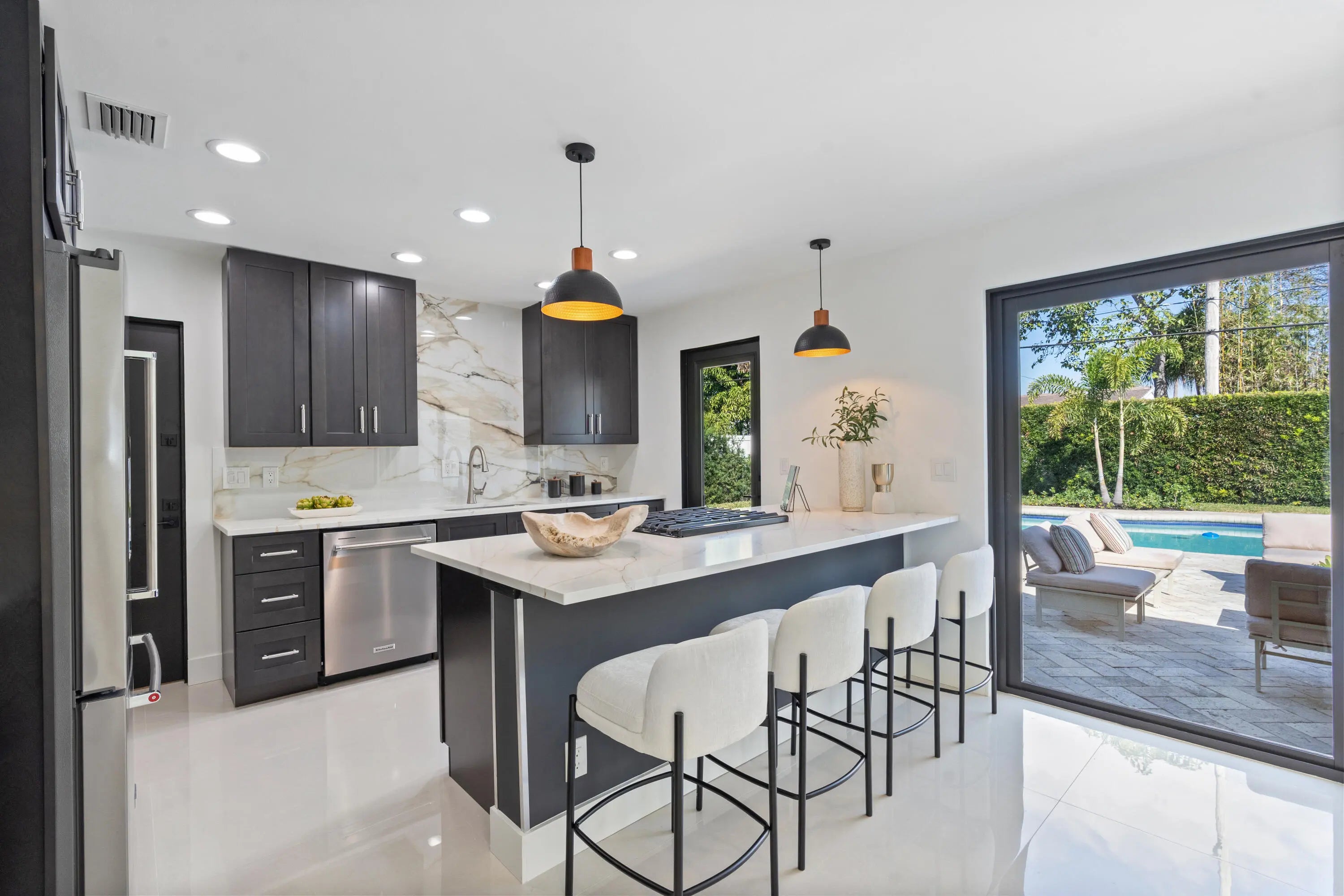 New renovation completed 2026, this stunning Mid-Century Modern 3-bedroom, 2-bath home blends timeless design with today's most desirable upgrades. A brand-new semi-circular driveway and lush landscaping create standout curb appeal. Inside, Level 5 smooth drywall and expansive porcelain tile flooring deliver a sleek, modern aesthetic. The redesigned kitchen is a showpiece with quartz countertops, custom cabinetry, a gas range, and all-new finishes. Both bathrooms feature stylish contemporary updates. New electrical and plumbing, new a/c, hurricane impact windows and doors, and a 2019 tile roof provide lasting peace of mind. Step into your private backyard oasis with a fenced yard with a resurfaced (2026) Marcite in-ground pool, and built in grill. Ideally located in the SoSo neighborhood!