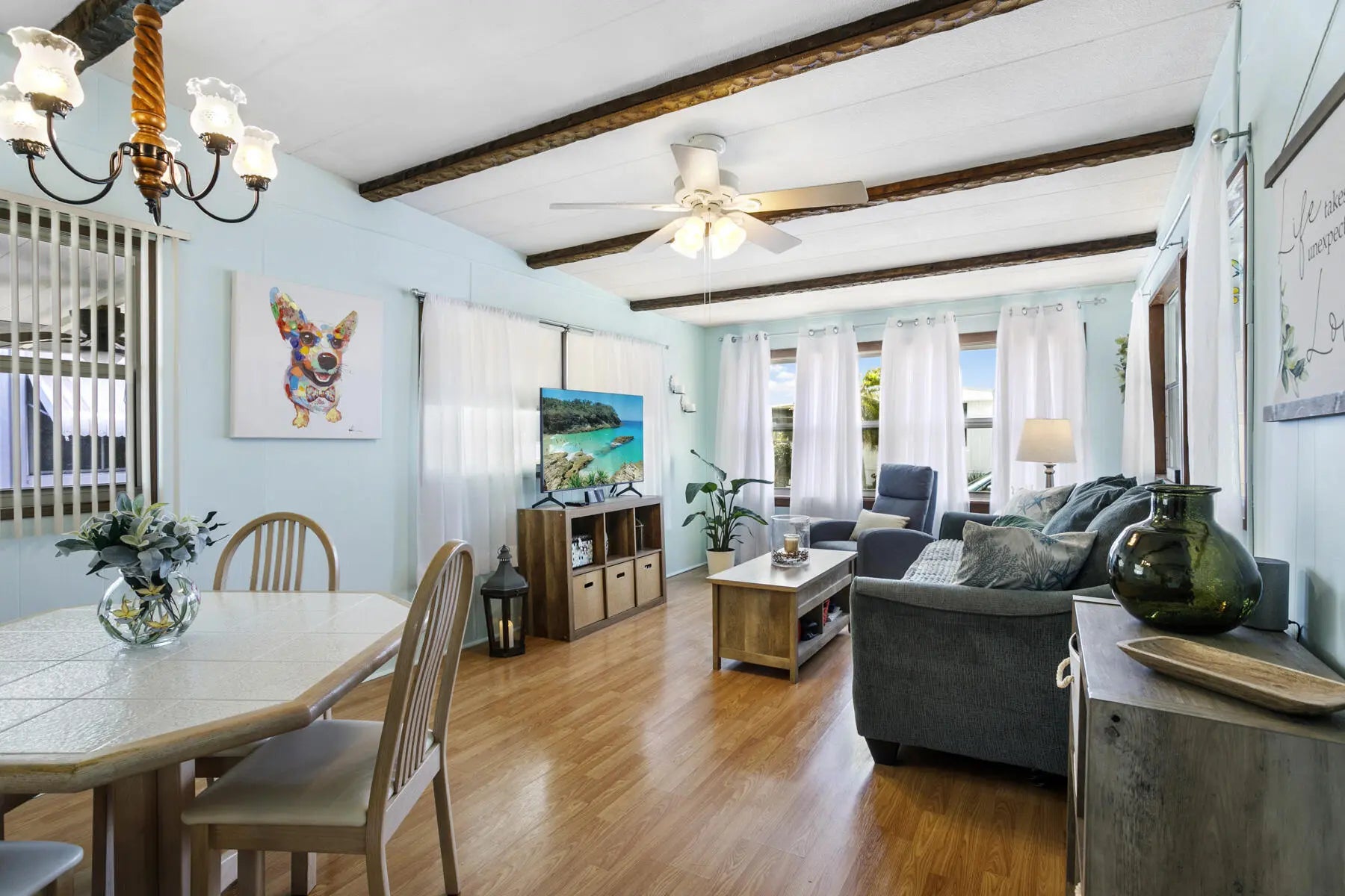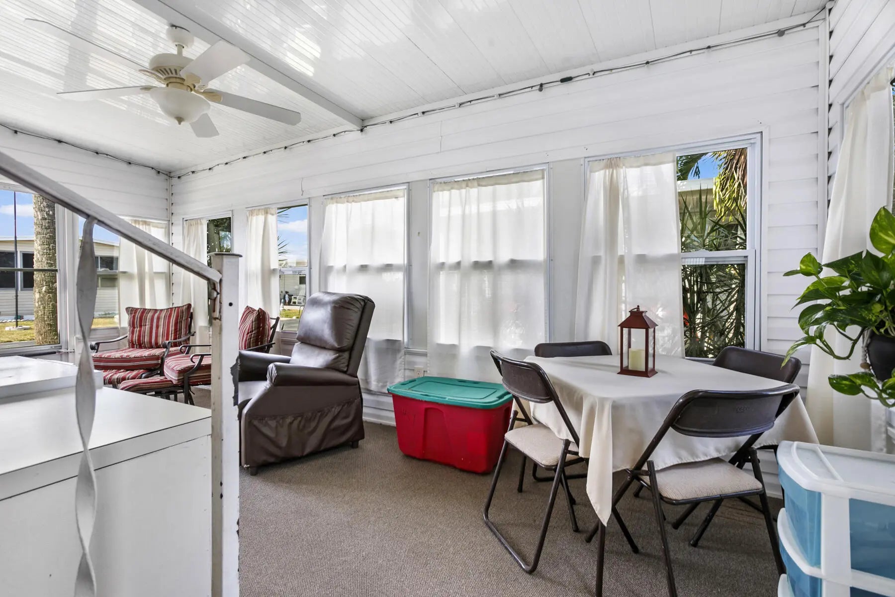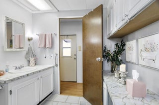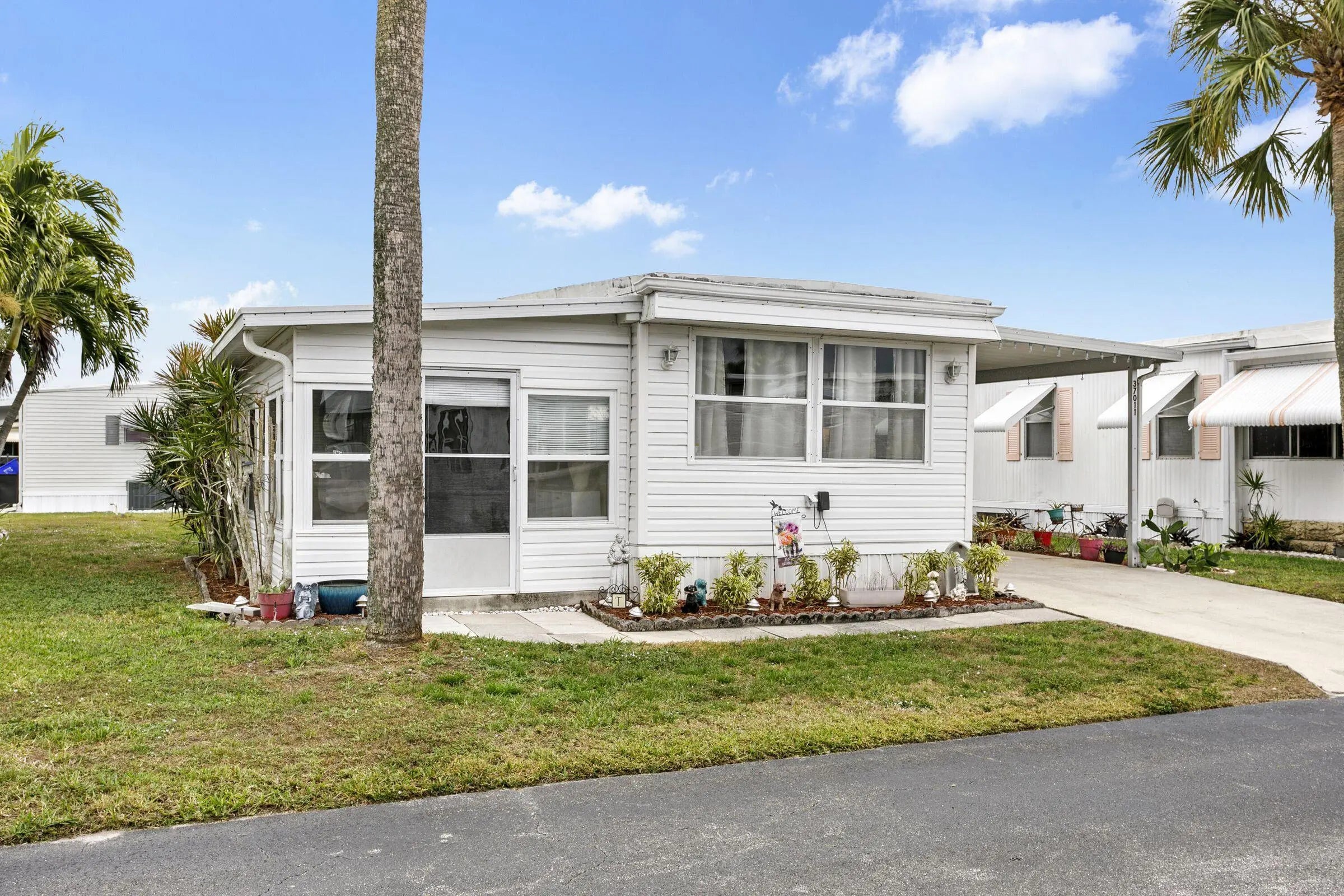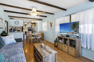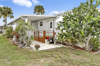 This charming 2 bed, 1 bath home sits in a desirable 55+ gated community offering abundant activities, including pickleball courts, shuffleboard, heated pools, bingo, cards, dances, potlucks, and game nights. Recently painted, it features laminate flooring, vaulted living‑room ceilings with decorative beams, newer windows, and a kitchen with ample counter space and a breakfast bar. Enjoy extra living space in the spacious Florida room. The second bedroom works well for guests or an office, and the main bedroom connects to a step‑in shower bath. A side‑entry ramp and storage shed with washer and dryer add convenience. Ideal for snowbirds, the home is easy to maintain and close to beaches, shopping, and dining.