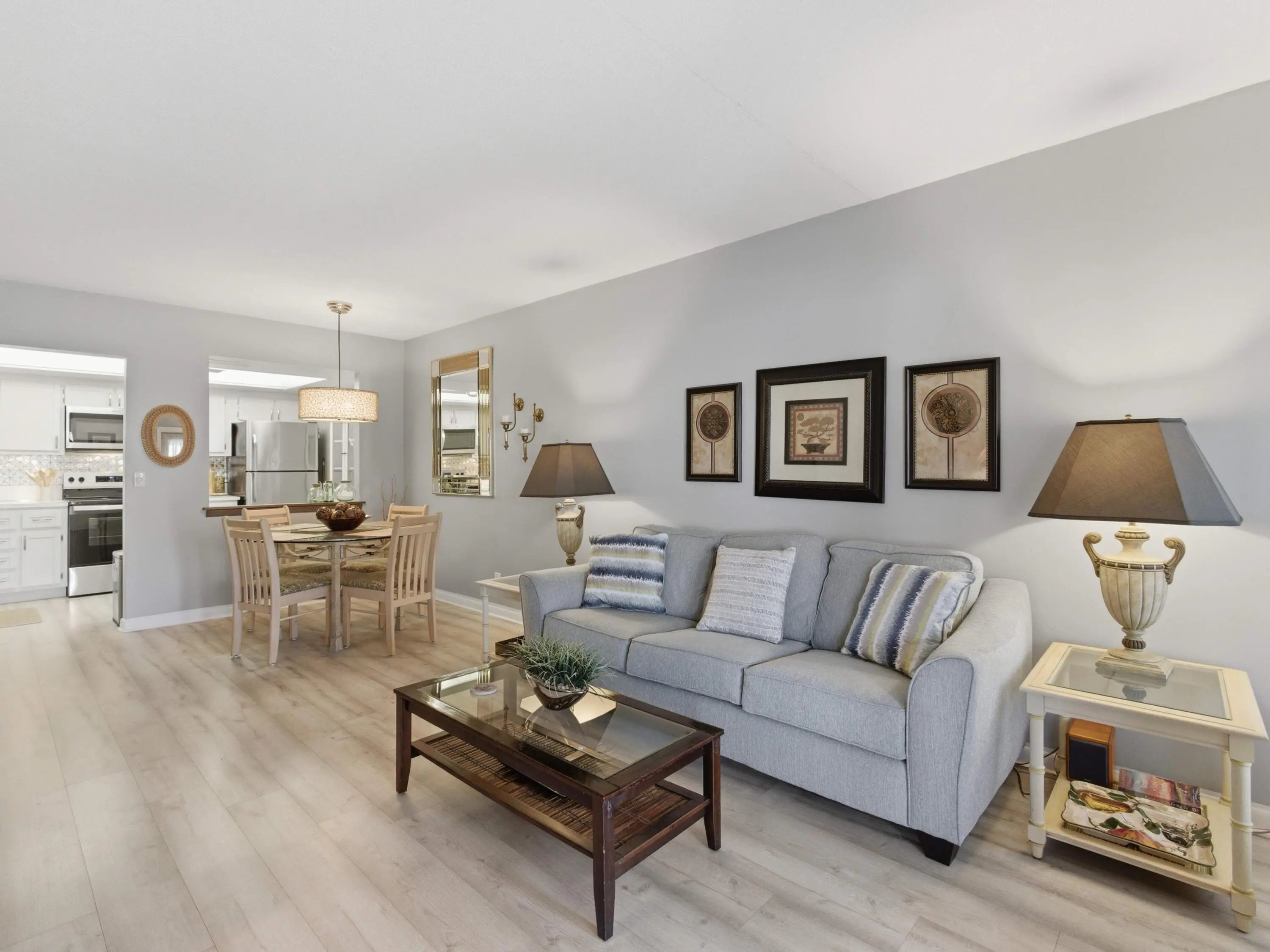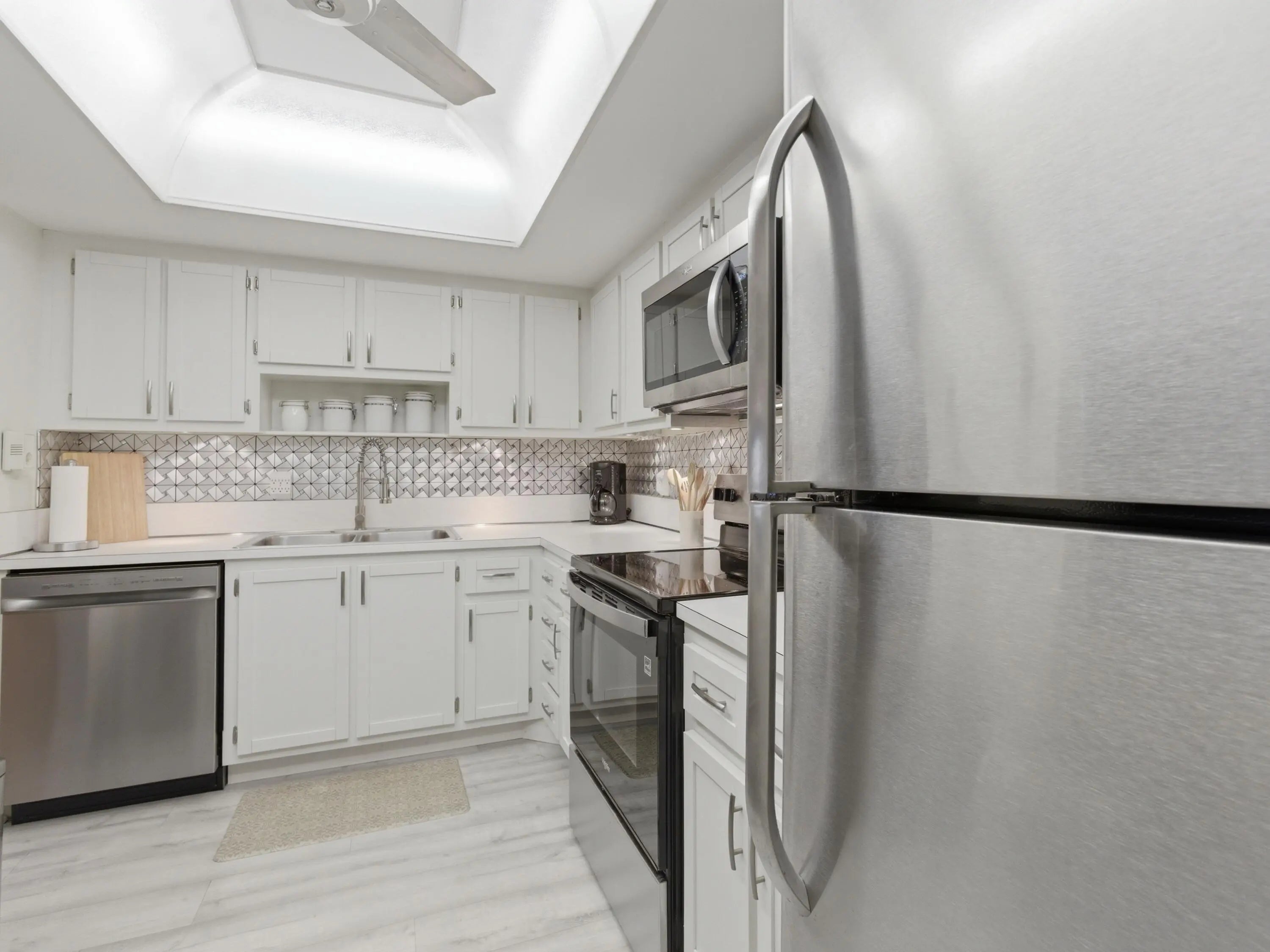 Welcome to Four Sea Suns in beautiful Boynton Beach -- a hidden coastal gem just minutes from the Atlantic Ocean, pristine beaches, and waterfront dining. This stunning 2-bedroom, 2-bath villa offers the perfect blend of comfort, thoughtful updates, and easy Florida living. The interior features stylish luxury vinyl flooring throughout with no carpet, creating a clean, modern feel that is both attractive and low maintenance. A new electrical panel adds additional peace of mind.The kitchen is equipped with newer appliances including a stove, microwave, dishwasher, and disposal, along with updated faucets and quarter-turn shutoffs for added convenience. Both bathrooms have been refreshed, including the addition of a sleek glass shower door. A washer and dryer are included, and the