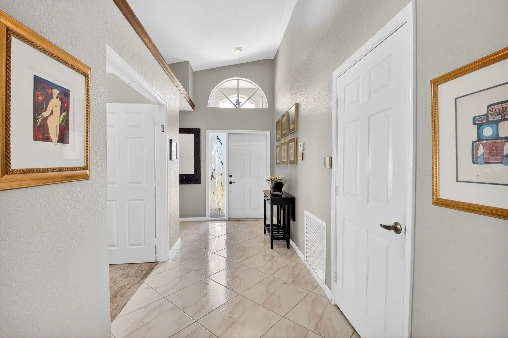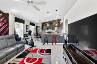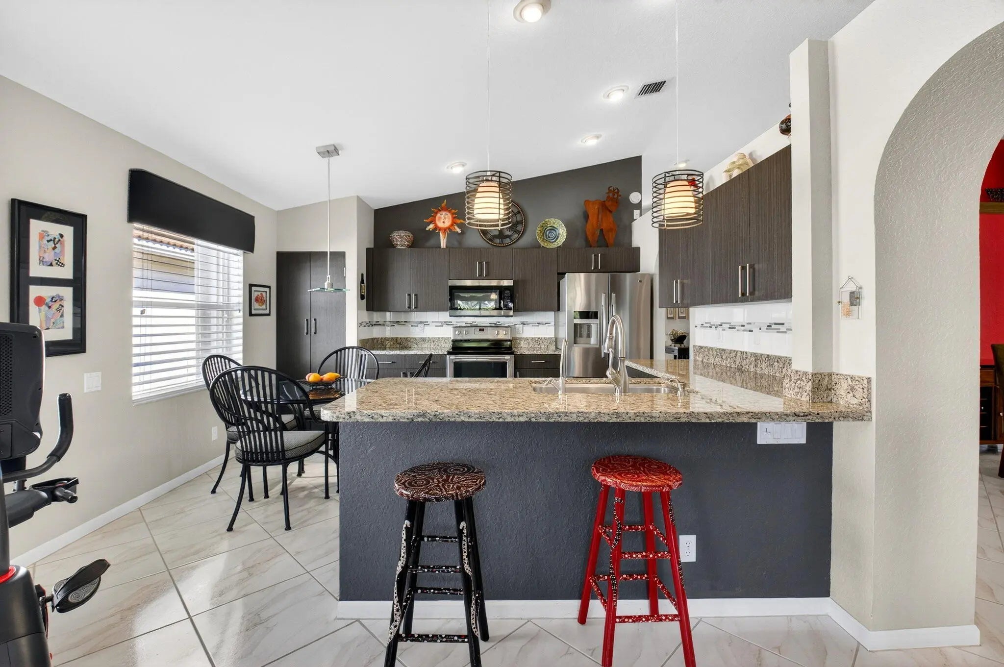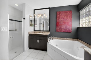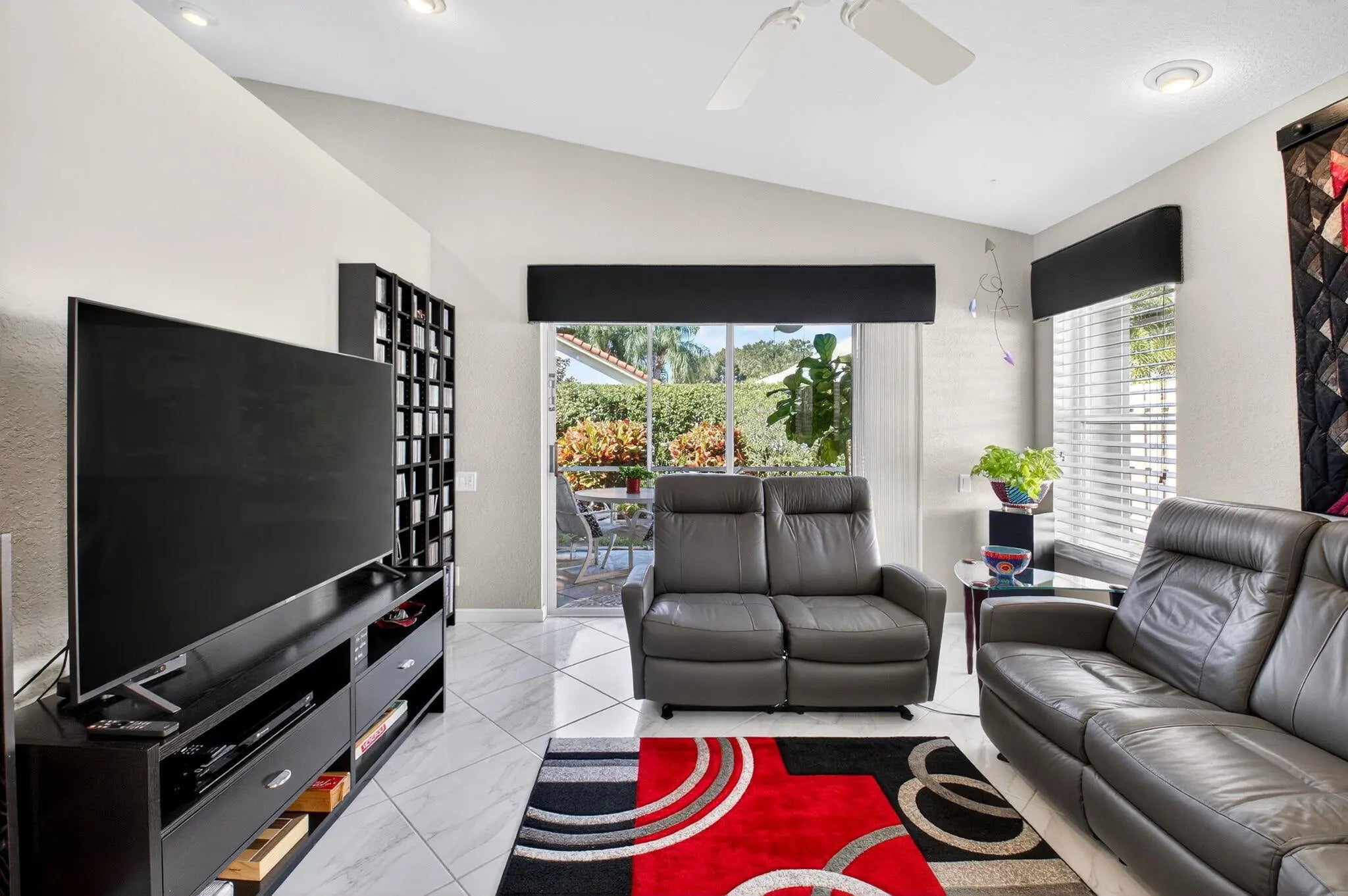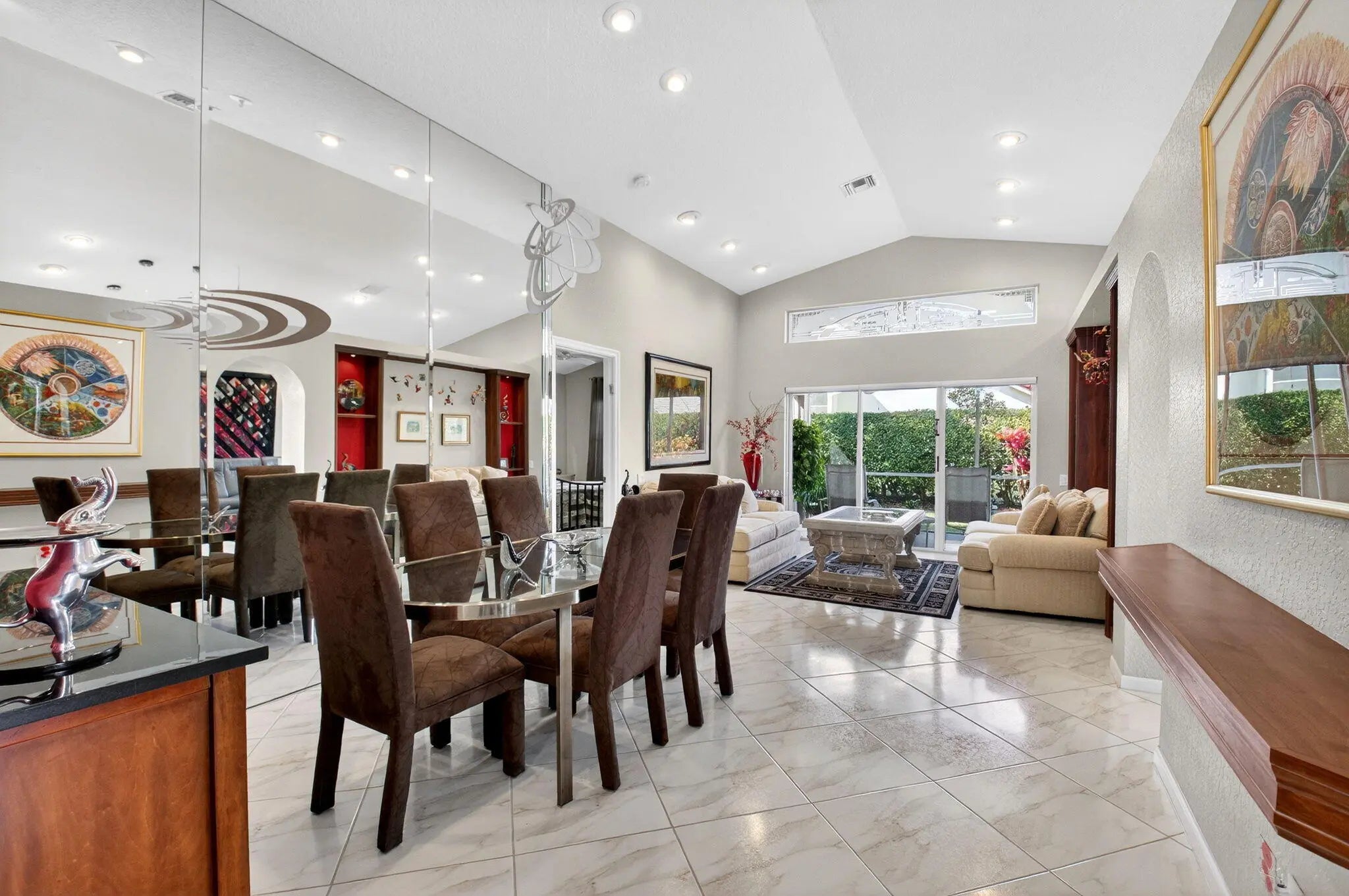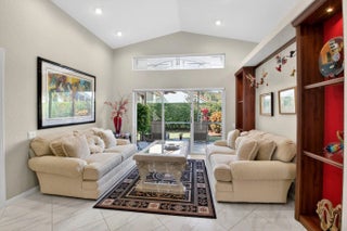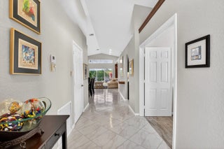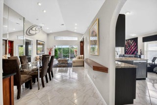 Welcome to your own piece of paradise! This stunning, beautifully decorated home offers a NEW ROOF (2021) as well as a thoughtful blend of comfort, style and functionality. With 3 spacious bedrooms, 2 updated baths, every detail has been meticulously upgraded to create a true sanctuary. When you drive up you are greeted with a paver driveway and tropical greenery which is conveniently maintained by the association. Inside you'll find soaring ceilings, elegant flooring on the diagonal and recessed lighting which adds warmth and richness throughout. The remodeled kitchen is a showstopper, with solid surface countertops, stainless steel appliances and soft-close cabinets adorned with some pull-outs. The updated primary bath offers double vanities, walk-in shower and a jacuzzi jetted tub