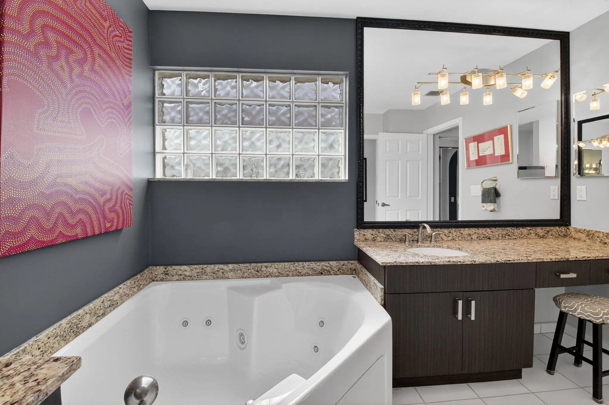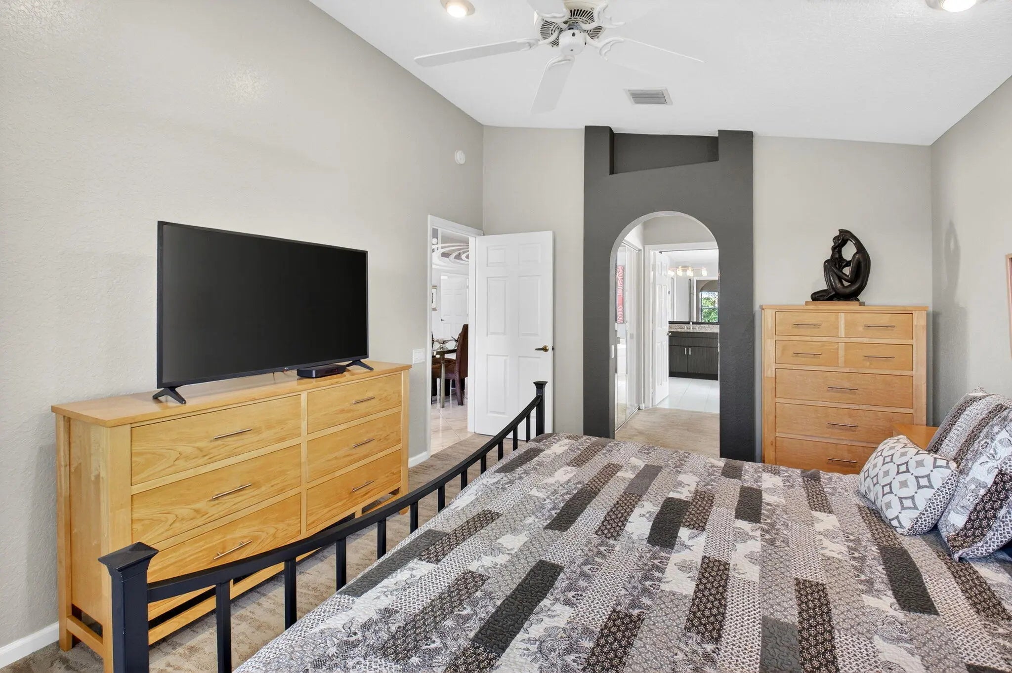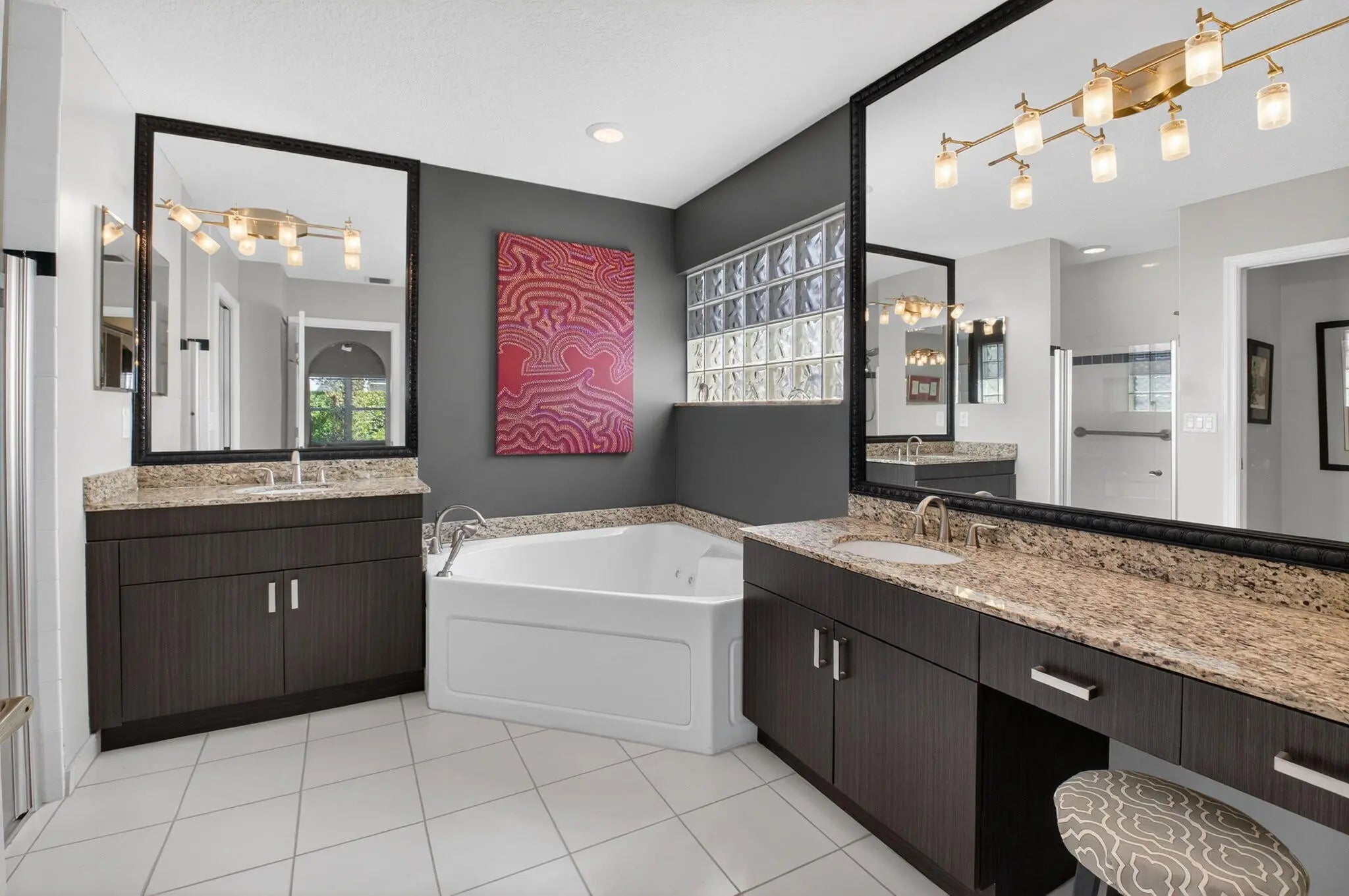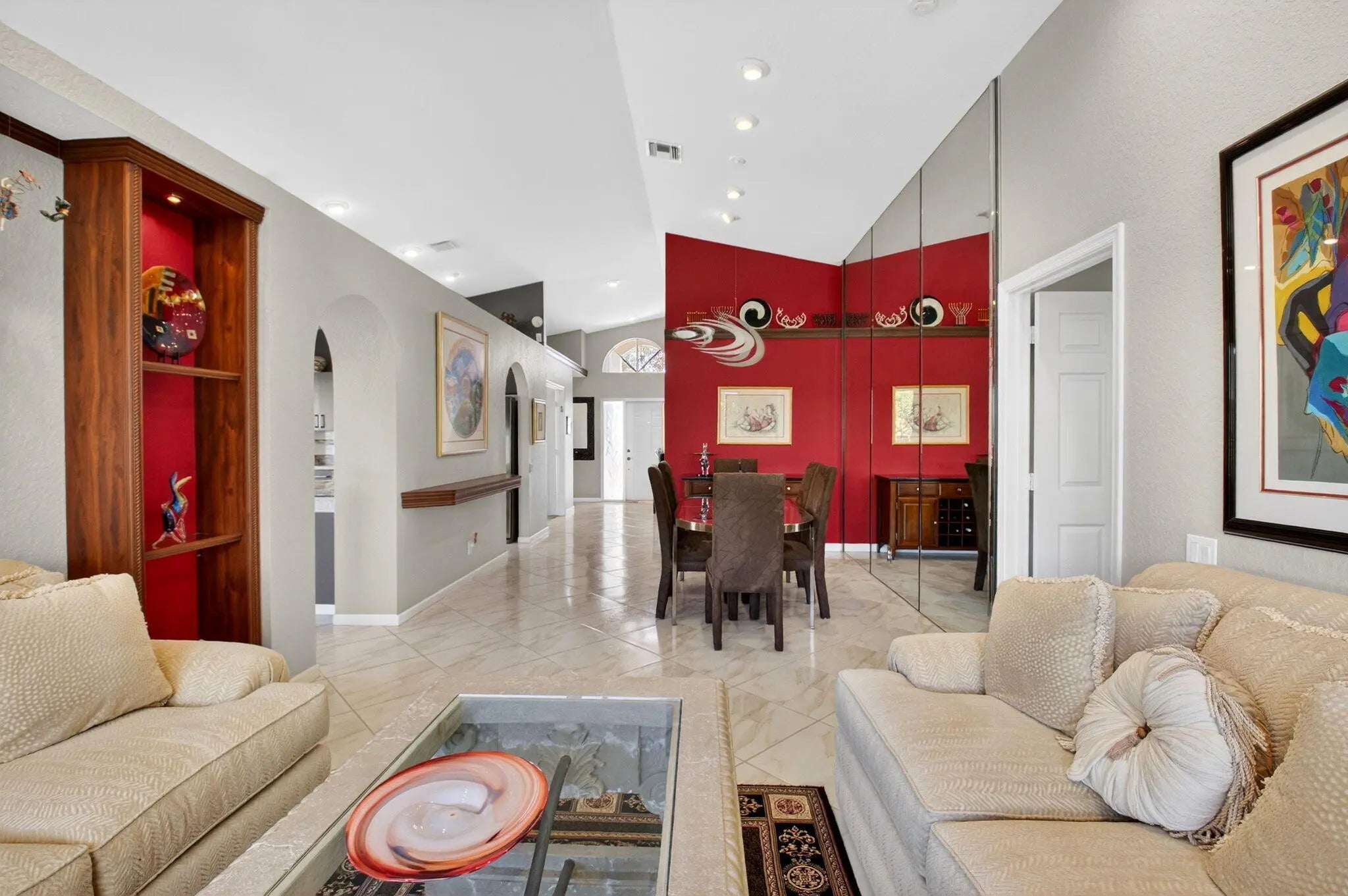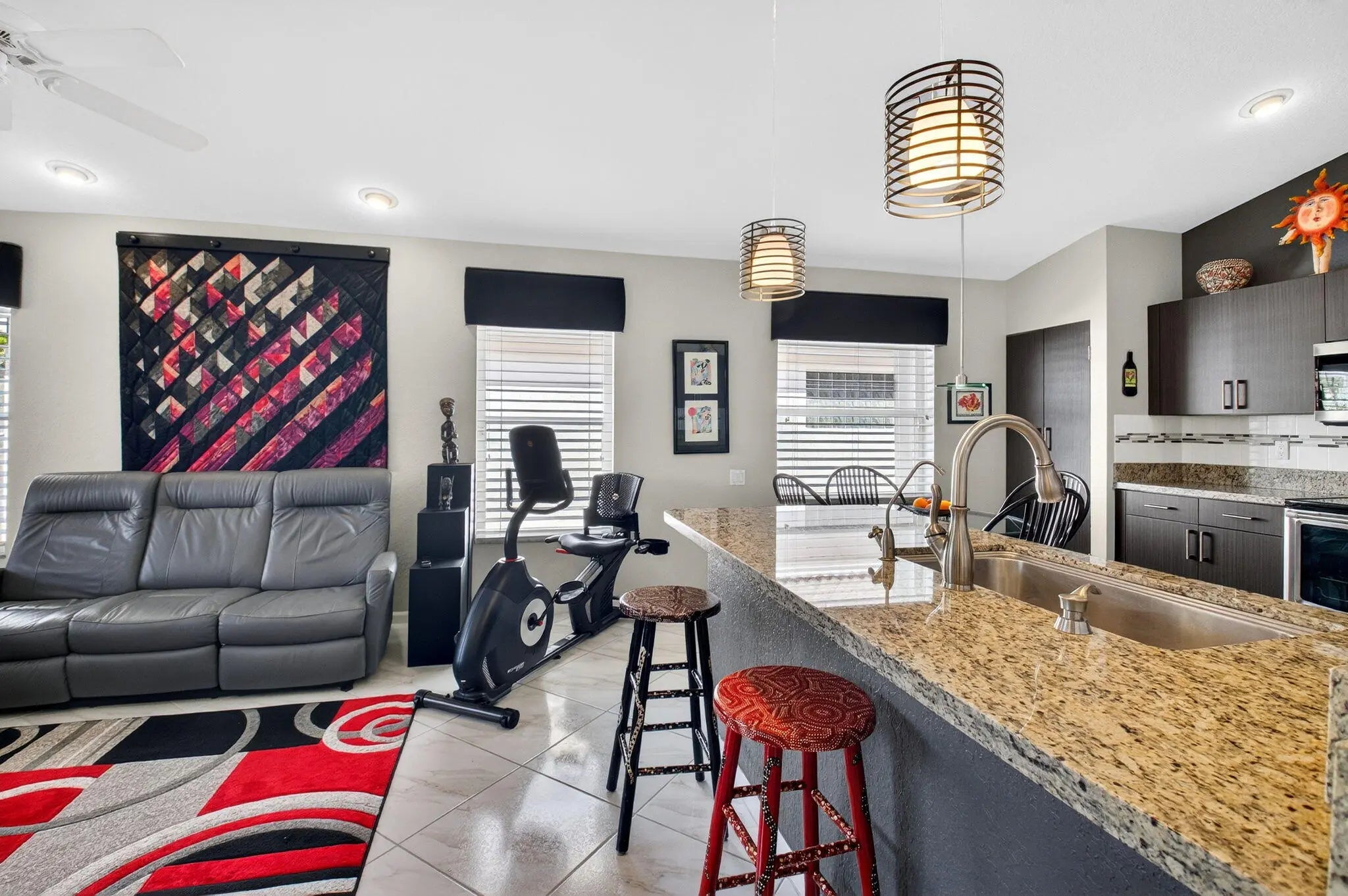 Welcome to your own piece of paradise! This stunning, beautifully decorated home offers a NEW ROOF (2021) as well as a thoughtful blend of comfort, style and functionality. With 3 spacious bedrooms, 2 updated baths, every detail has been meticulously upgraded to create a true sanctuary. When you drive up you are greeted with a paver driveway and tropical greenery which is conveniently maintained by the association. Inside you'll find soaring ceilings, elegant flooring on the diagonal and recessed lighting which adds warmth and richness throughout. The remodeled kitchen is a showstopper, with solid surface countertops, stainless steel appliances and soft-close cabinets adorned with some pull-outs. The updated primary bath offers double vanities, walk-in shower and a jacuzzi jetted tub