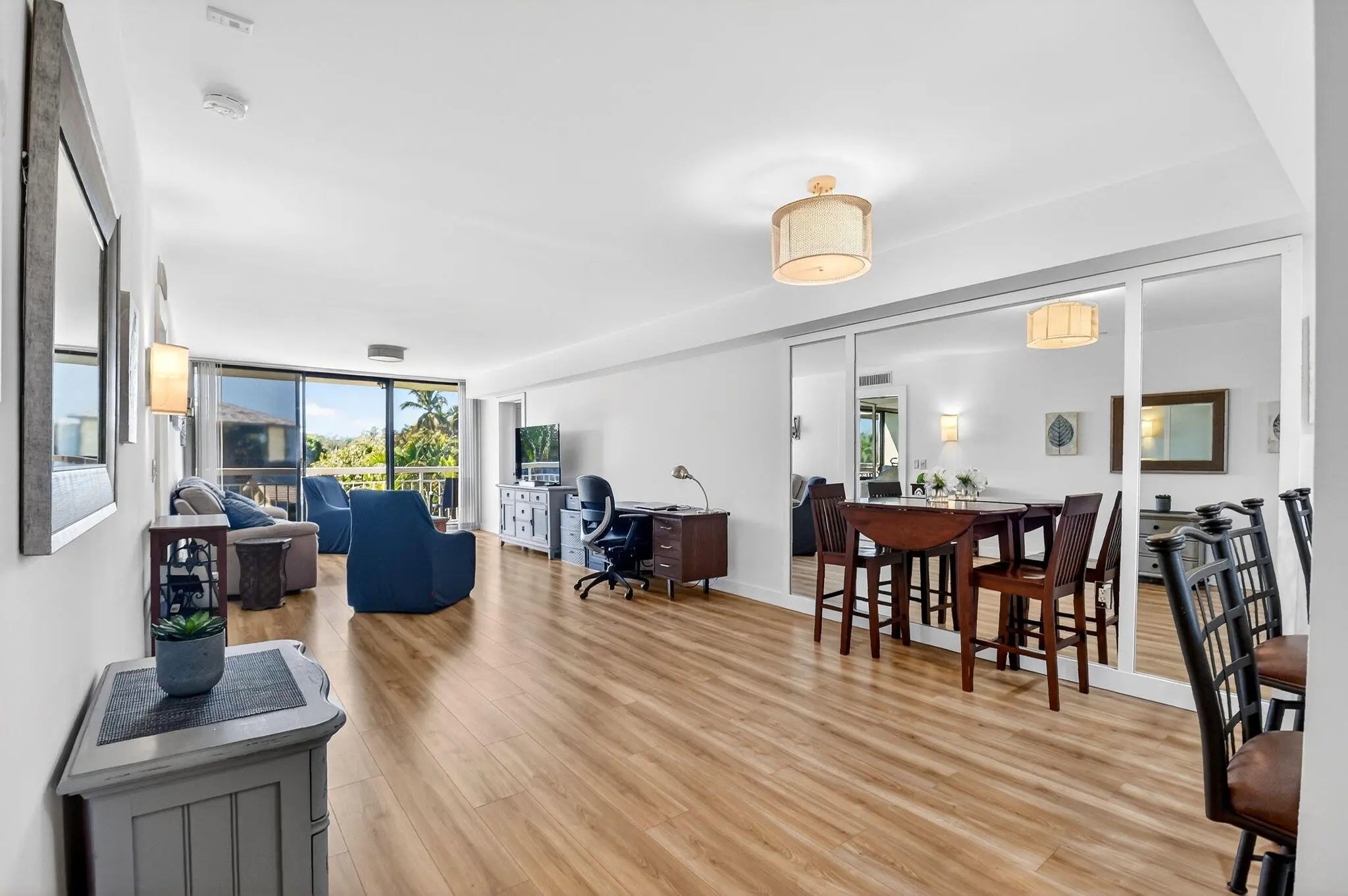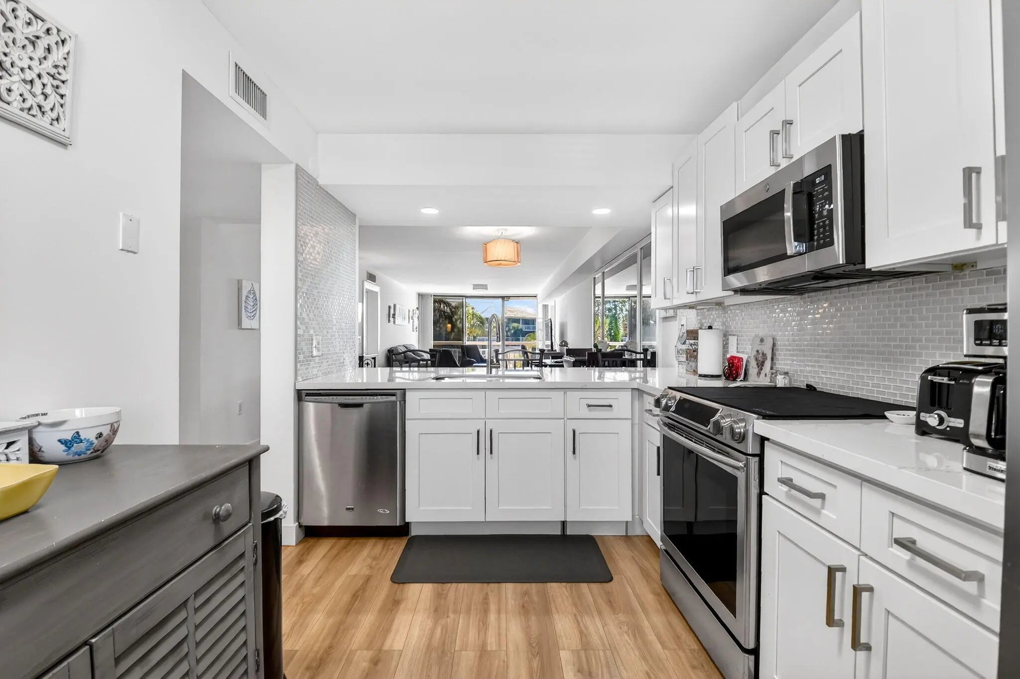 Spacious 3rd floor renovated and move in ready 2 bedroom, 2 bath condo overlooking the Whitehall community pool. Long balcony with 2 entrances, new HVAC, luxury vinyl plank flooring, neutral colors, modern, updated kitchen with white shaker style cabinets and stainless steel appliances. With 1437 sq ft of living space, there is an extra large dedicated laundry room, part of which can be used as extra storage or an office space. Central location, close to shopping, restaurants, I-95 and PBIA.