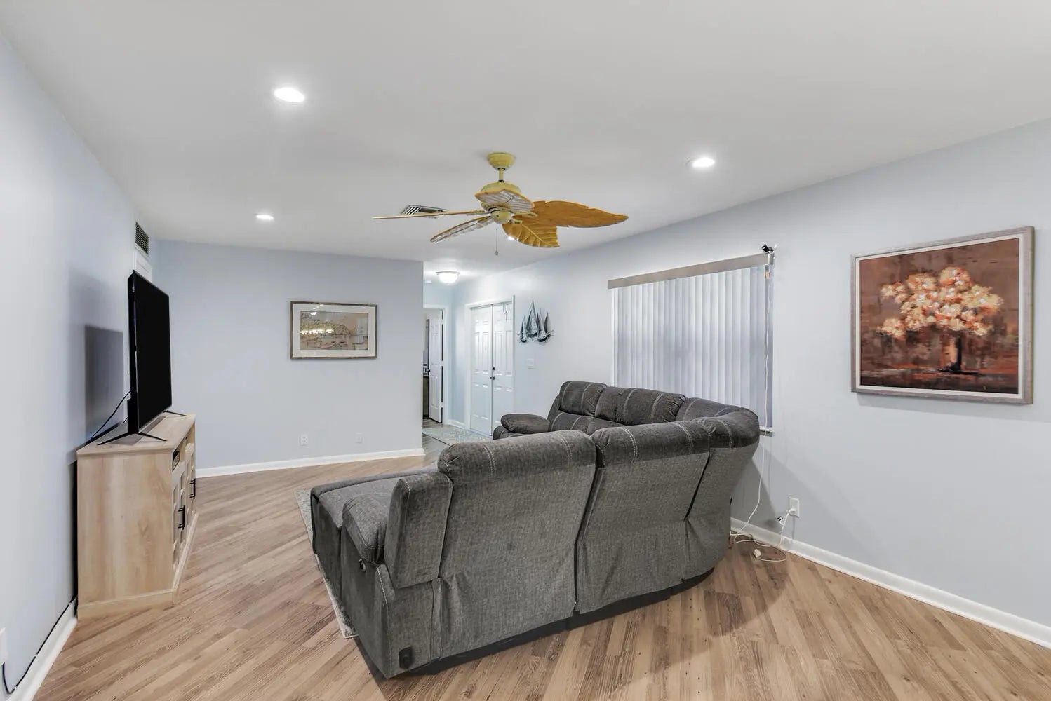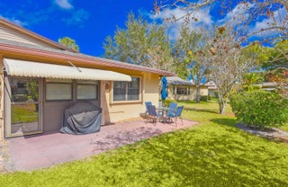 Beautifully updated corner villa with double door entry. Remodeled kitchen and bathrooms; neutral wood-like flooring through out; built in closet system in primary bedroom. Accordion shutters for hurricane protection, gutters and leaders all around. Roof 2024, A/C unit 2018, Hot water heater 2021. Lovely Florida room and patio with open space yard for green-scape and spacious atmosphere. The community is low density and an active 55+ with a clubhouse and pools. The maintenance fee includes water, cable, lawn care, roof maintenance, building insurance. and reserves.