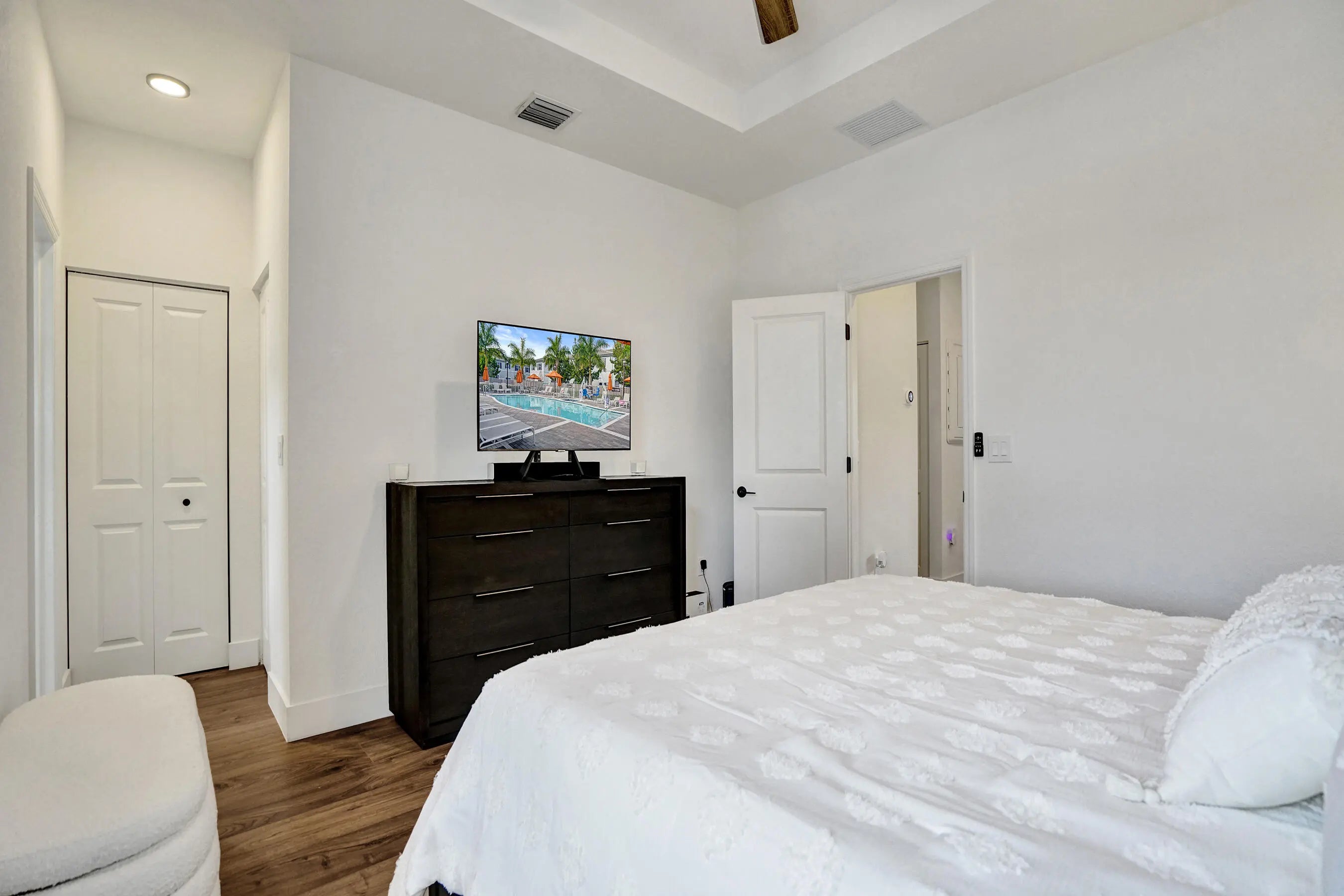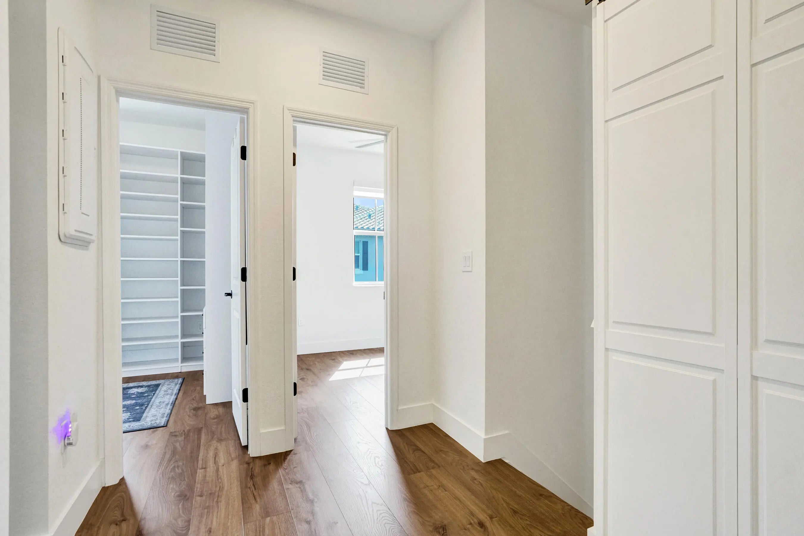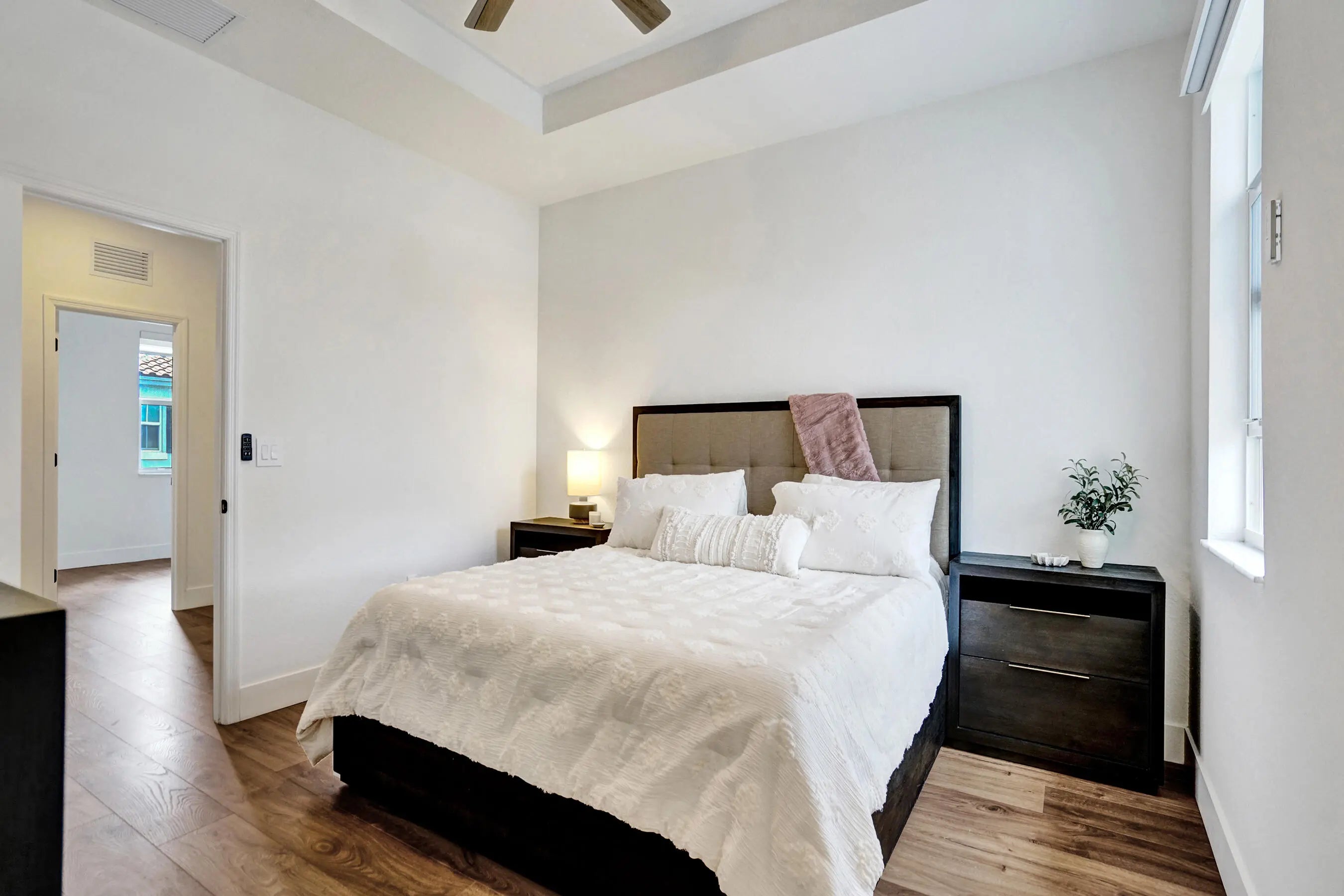 Welcome to Sunset Trails, a gated neighborhood offering full amenities and community events with low HOA fees and all A-rated schools! This newer construction townhome truly stands out with upgrades and improvements that go well beyond the builder's original finishes. Featuring full impact windows and doors for added peace of mind, the home is enhanced with luxury laminate wood flooring throughout, creating a seamless and modern feel. Natural light pours into the open living spaces, complemented by zebra automatic shades with remote controls for effortless style and convenience. The spacious bedrooms provide comfort and flexibility, with one room that has been thoughtfully redesigned into an unbelievable custom closet that any buyer will LOVE! The primary suite serves as a private retreat