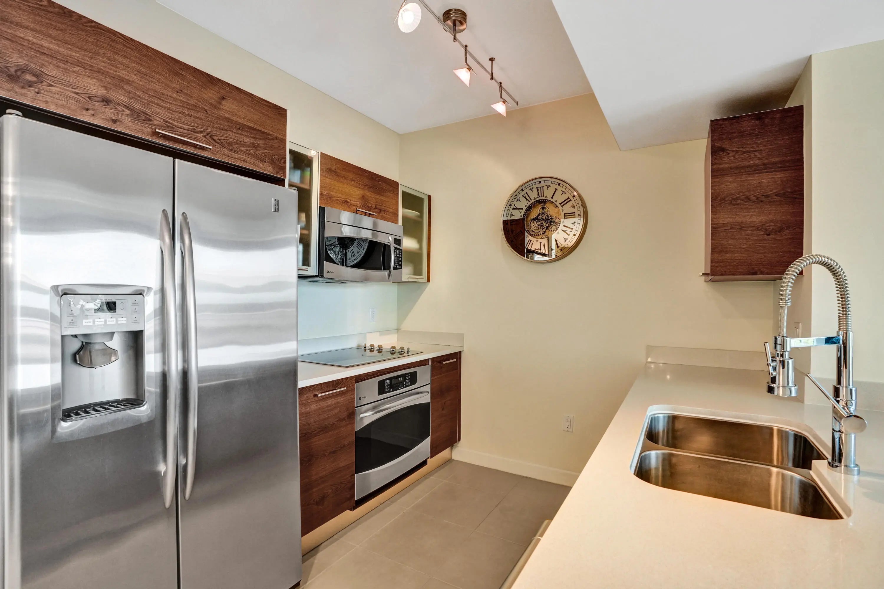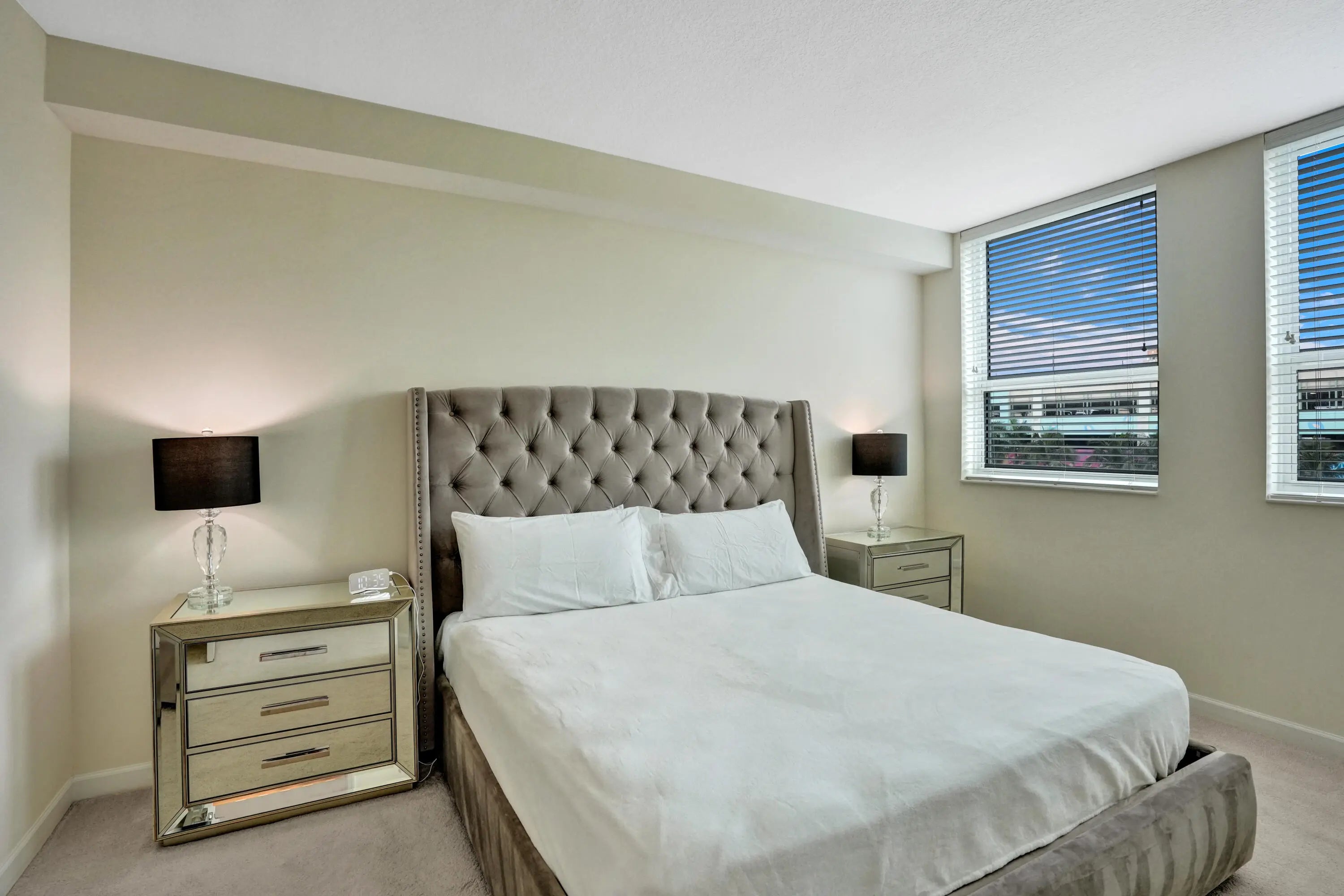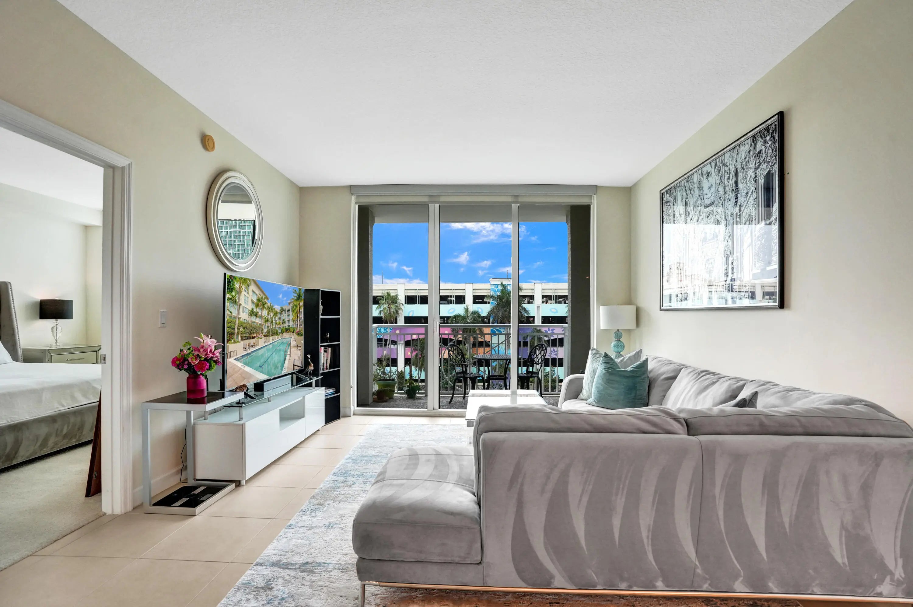 This sophisticated 2BR/2BA residence at City Palms offers refined living in the vibrant heart of West Palm Beach. Positioned on the 4th floor, this light-filled condo features a thoughtfully designed split-bedroom layout and seamless open-concept living. The contemporary kitchen flows effortlessly into spacious living and dining areas, creating a modern, inviting ambiance. The primary suite boasts dual vanities, a soaking tub, glass-enclosed shower, and generous walk-in closet space. Impact glass, a private balcony with city views, same-level garage parking, in-unit washer/dryer, and 24-hour front desk/security enhance comfort. Enjoy a 70-foot pool, spa, fitness center, sauna, lounge, and valet services. Just one block from City Place and moments to the waterfront, dining, and shopping.
