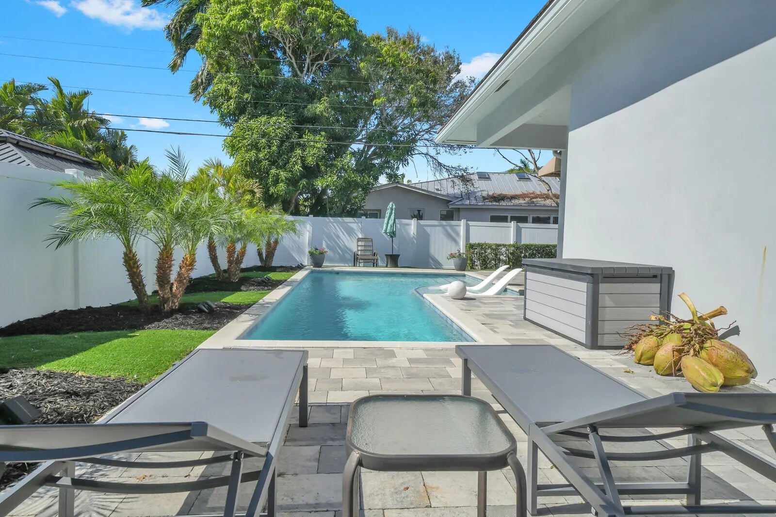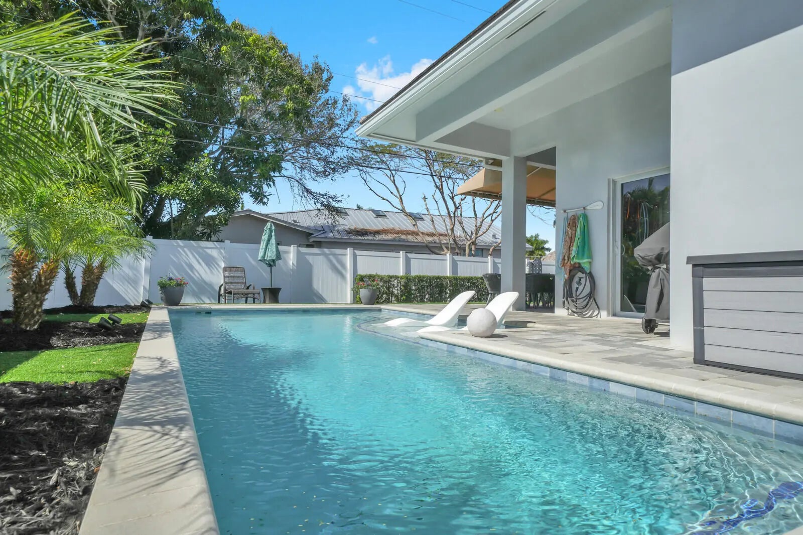 AVAIL MAY 1 through DECEMBER 2026- OFF SEASON, FURNISHED RENTA AVAILABLE FOR A FLEXIBLE LEASE TERM ANYWHERE FROM 3 to 7 MONTHS. Experience coastal elegance in the coveted Cove neighborhood of Deerfield Beach. This exceptional property, completely rebuilt and newly furnished, offers a unique blend of style and functionality. The open floor plan features high ceilings, huge chefs kitchen, and large primary suite with a luxurious spa-like bathroom and a large walk-in closet. Split bedrooms, two guest bedrooms. Step outside into your own tropical oasis, complete with a turfed yard and a heated pool featuring a sun shelf for relaxation. The outdoor space is perfect for entertaining, with multiple seating areas to accommodate guests.