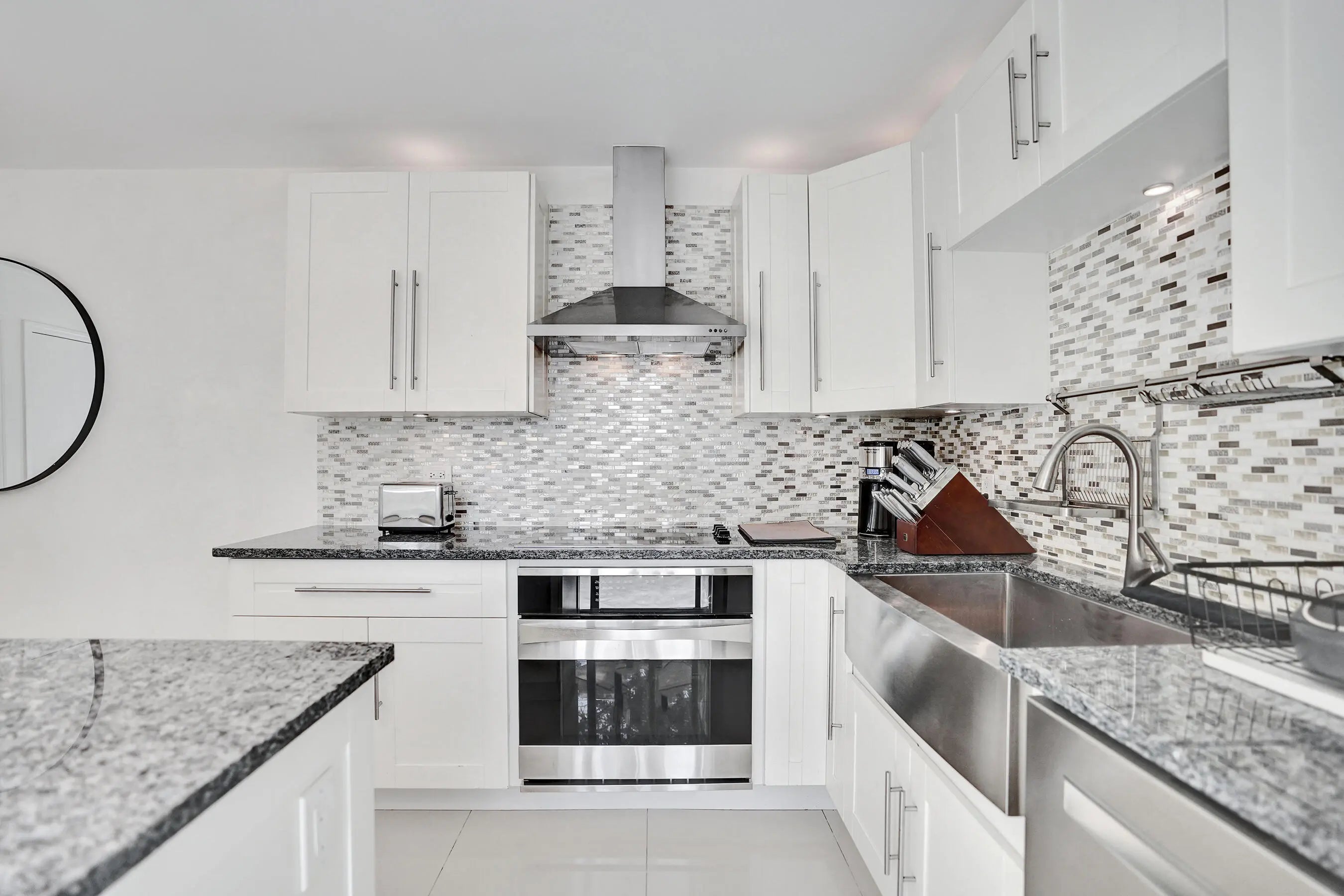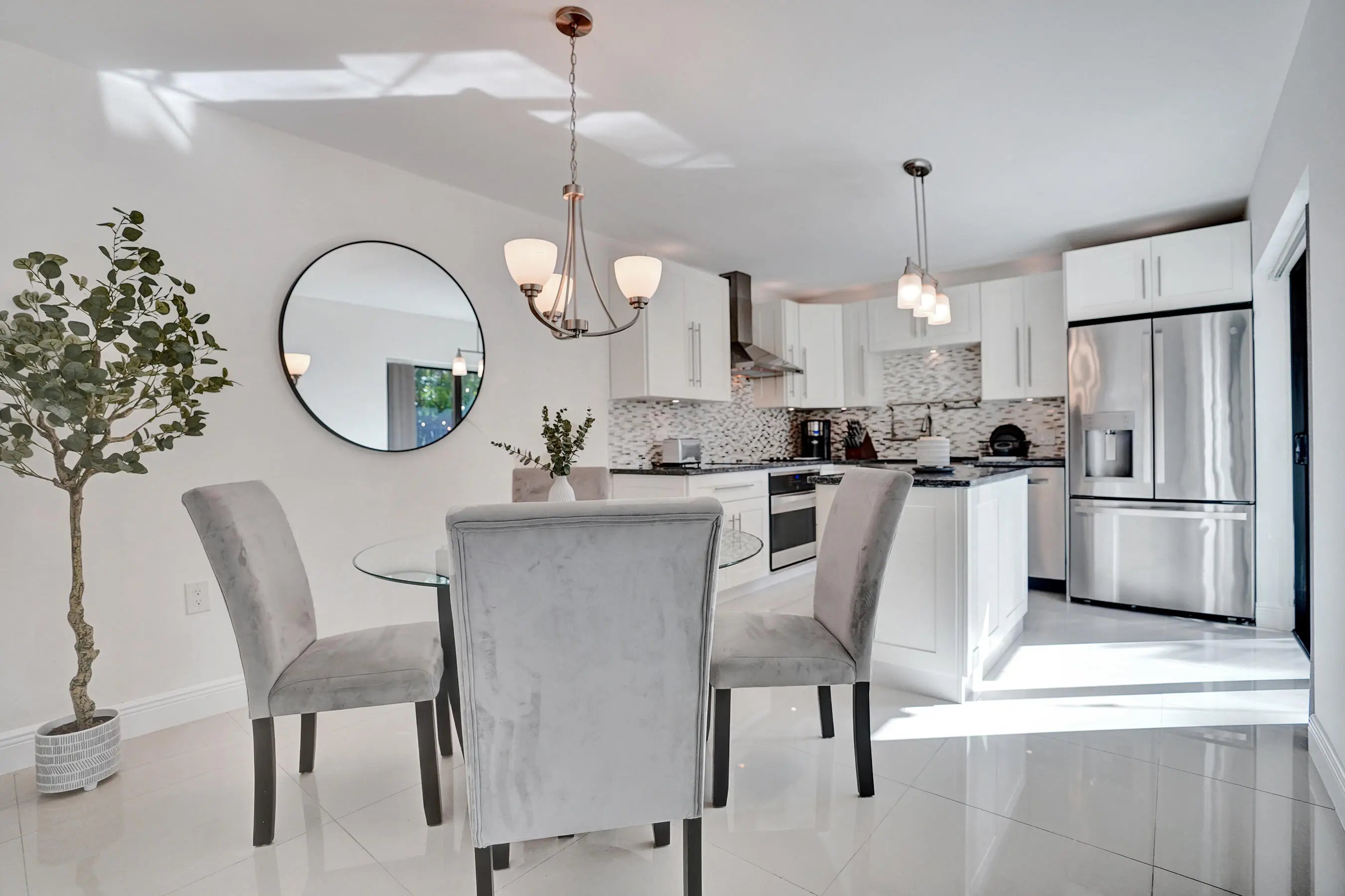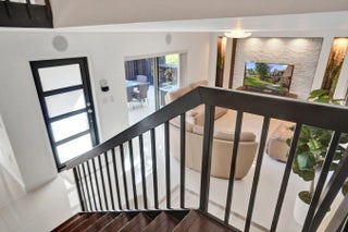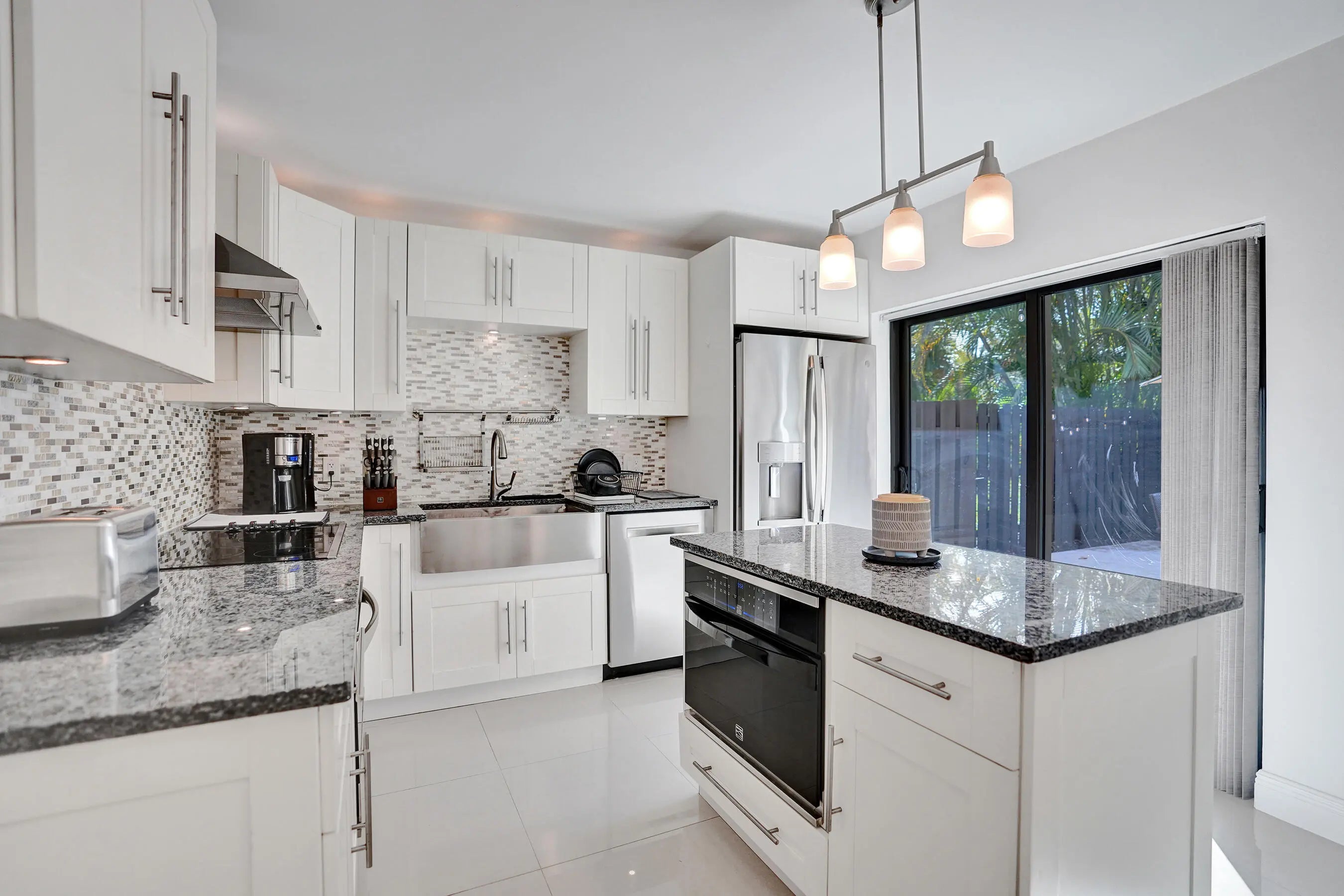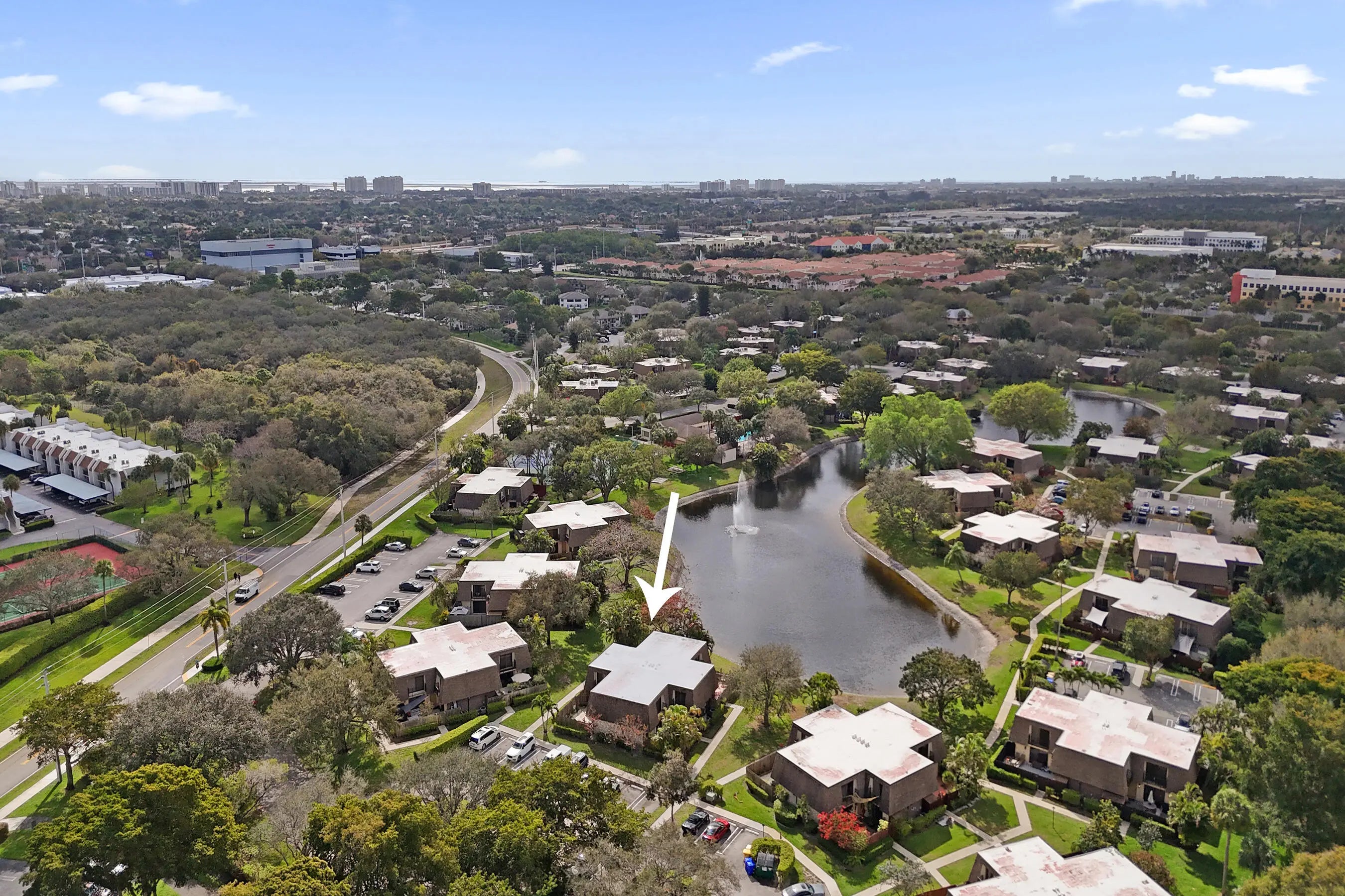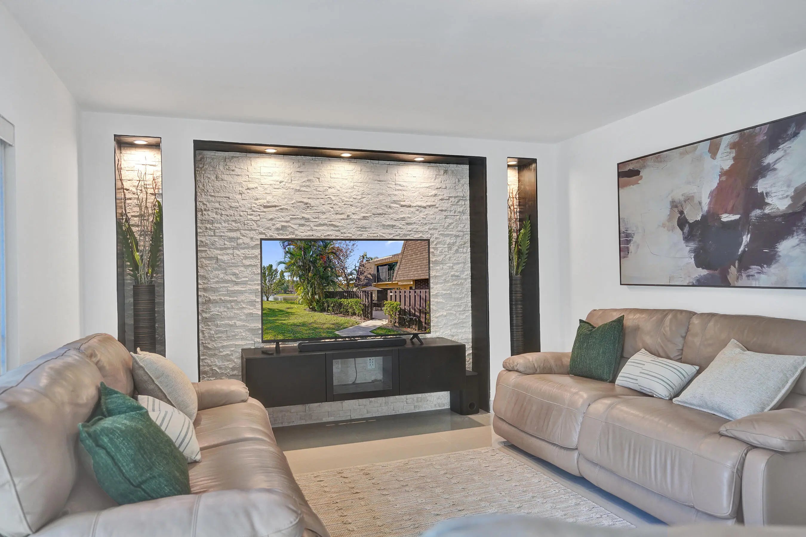 Welcome to one of the most desirable lakefront townhomes in Delray Beach. This beautifully updated two bedroom, two and a half bath residence offers one of the best water views in the entire community, with a massive private patio overlooking the lake that creates the perfect setting for relaxing evenings, outdoor dining, or entertaining friends while enjoying peaceful waterfront scenery. Inside, the home is filled with natural light from the welcoming front entry and thoughtfully designed layout. The living room features a striking custom stacked stone wall with LED accent lighting surrounding the television area, creating a warm and modern focal point. The renovated white kitchen is both stylish and functional with quartz countertops, stainless steel appliances, and an open layout that